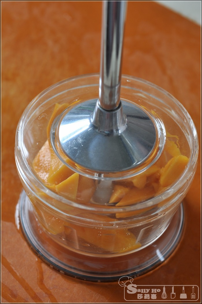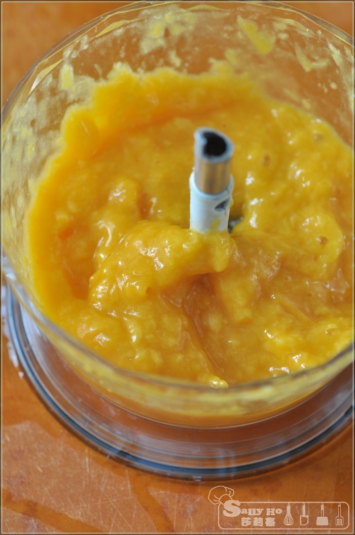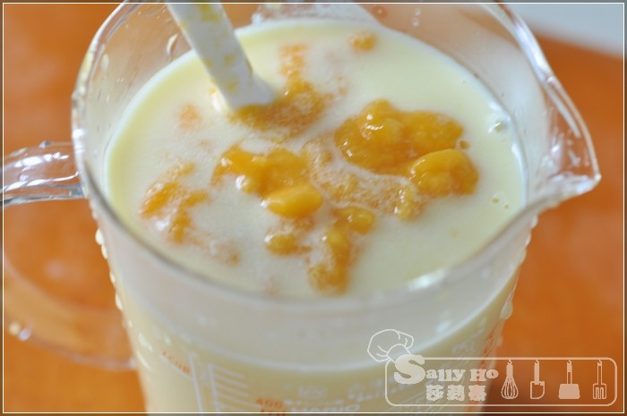 加入一杯淡忌廉及芒果蓉,及加入另一個芒果粒,就是這樣,最好加一杯芒果雪糕,會更好吃。