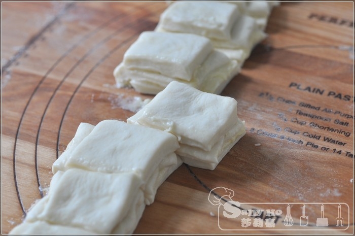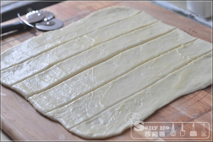 切成6條,3條層疊在一起,再分成8小件。