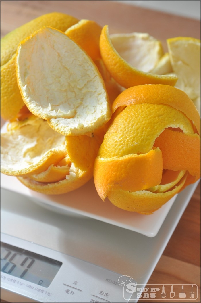 今次我用了4個橙皮(260g)為3份,糖(87g)為1份,水(867g)為10份,