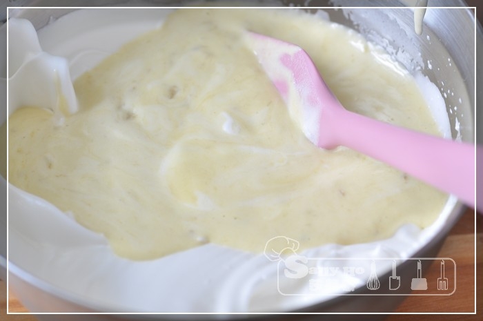 1) 蛋王及糖打至企身,(坐熱水打)加油及水拌勻,再加粉拌勻,加香蕉蓉