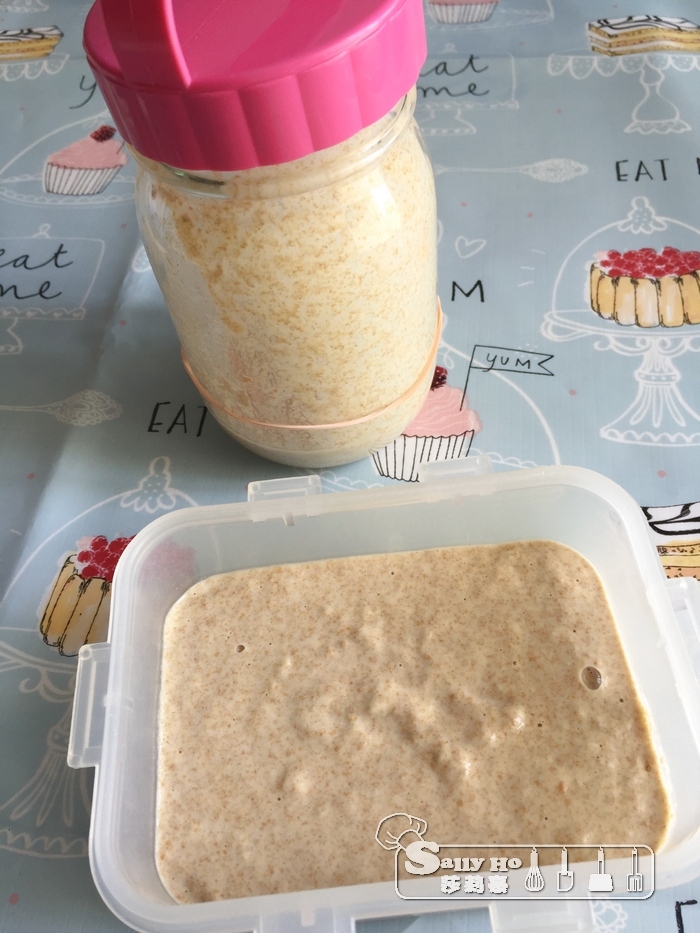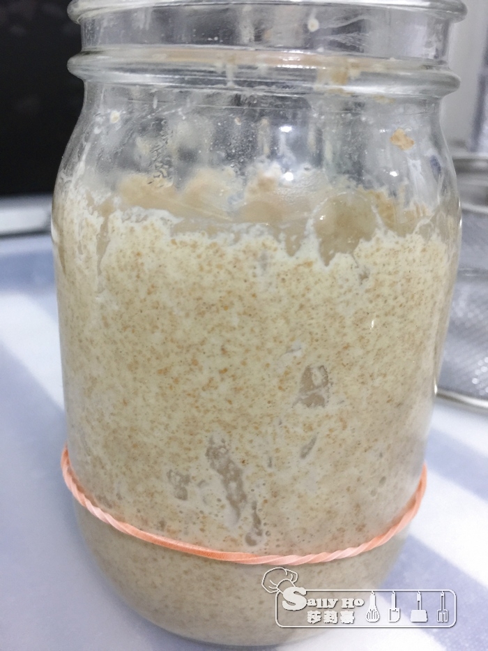 第一天,50g 麥粉, 50g水, 拌勻放24-48小時,目測升高一倍及有氣泡即可