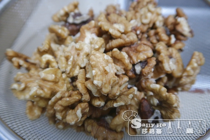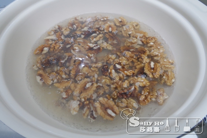 1) 先把合桃用熱水烚一分鐘,隔水用白鑊炒乾