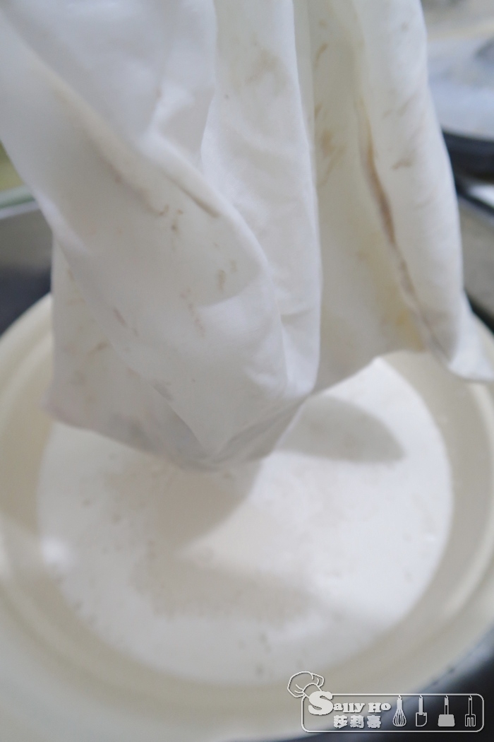 先用豆漿袋隔渣,留合桃水,即可煲滾下米漿控制稀濃度, 最後下冰糖即成。
