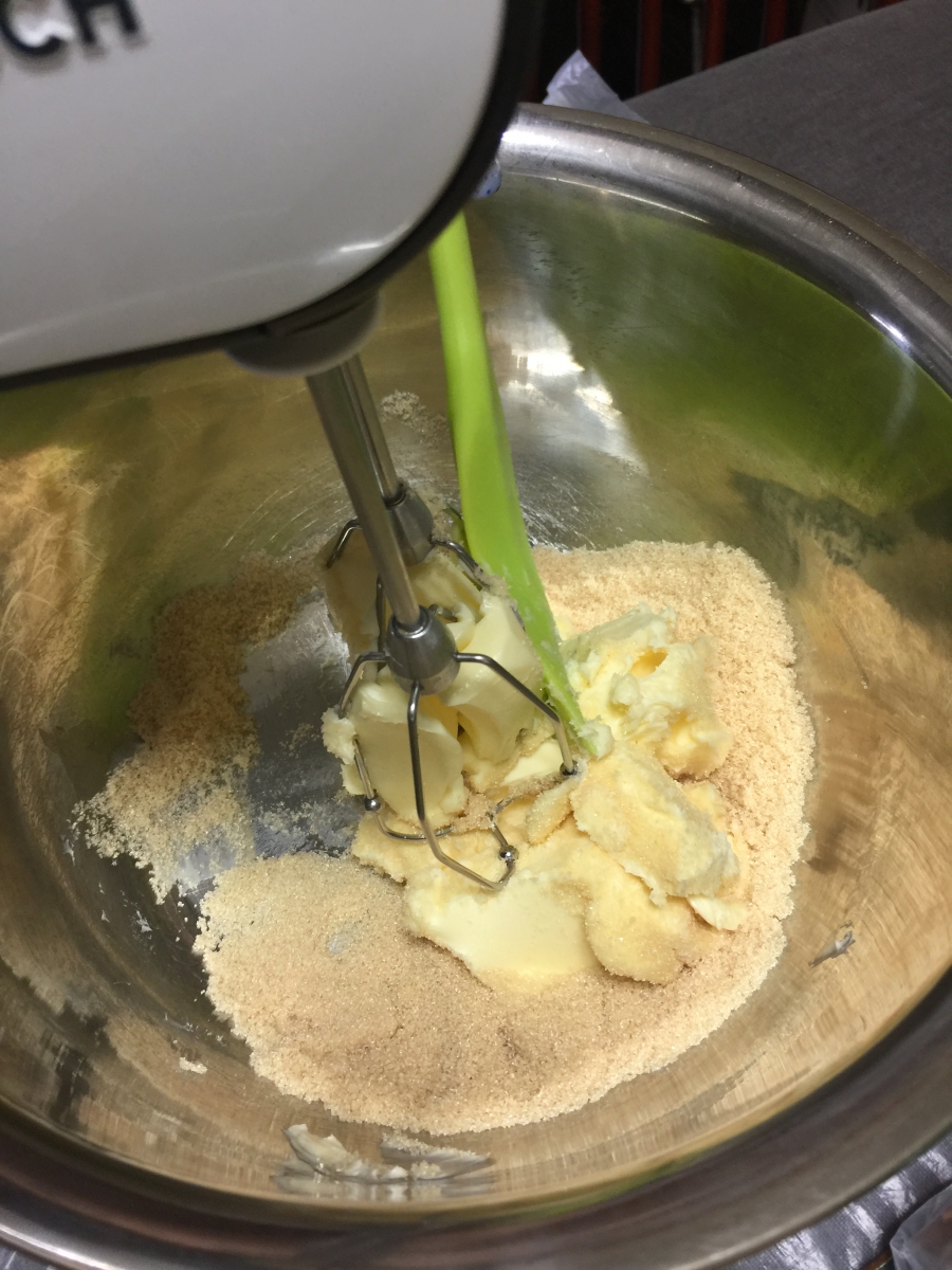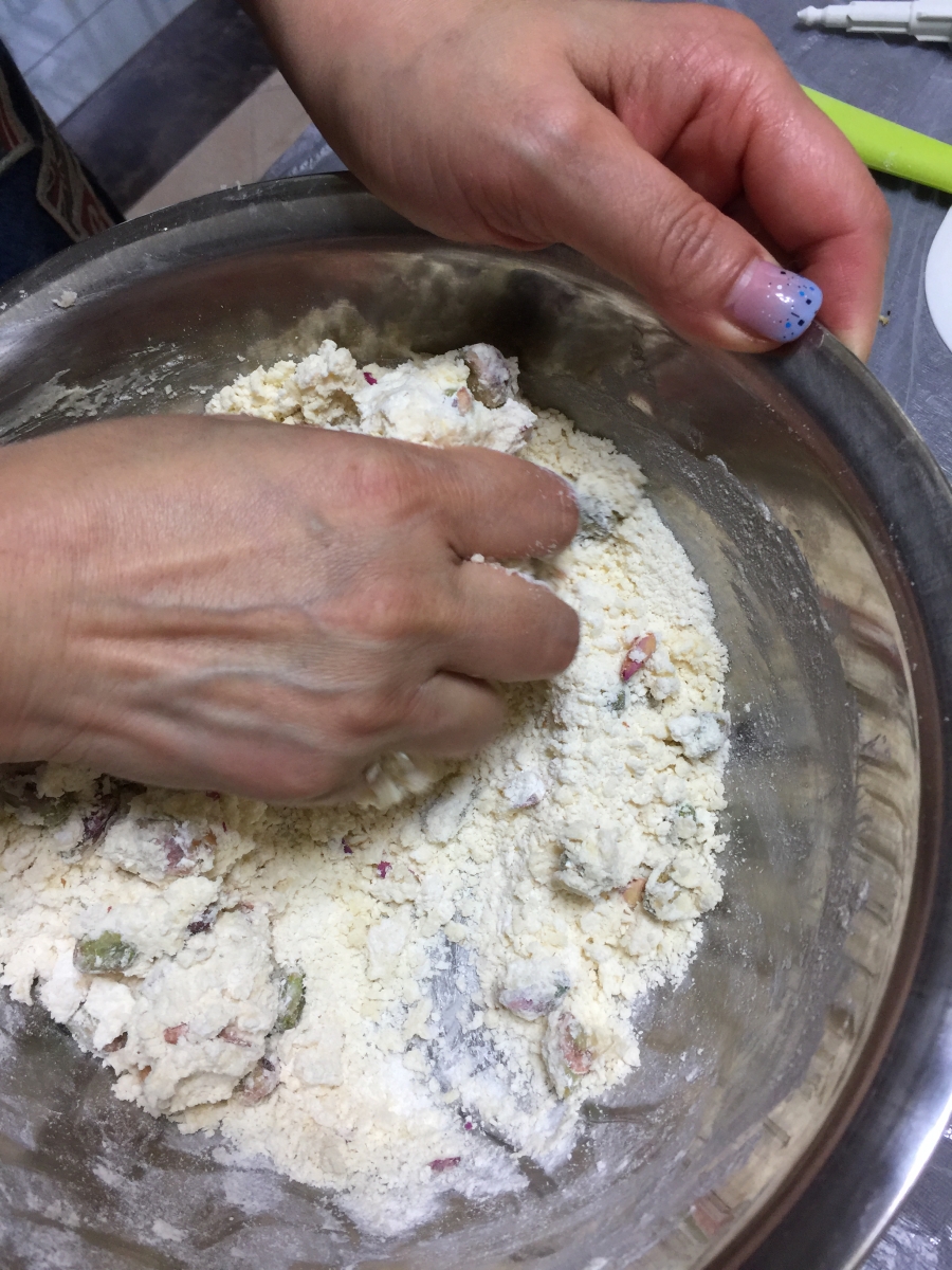 牛油,糖及香油打起,加粉類,開心果及玫瑰花乾用手搓成糰,
