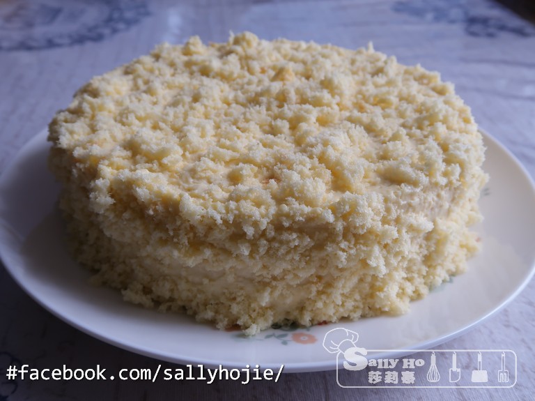 7) 冷藏完成後脫模,整個蛋糕抹上一層薄薄的軟芝士糊,撒上蛋糕碎即成。