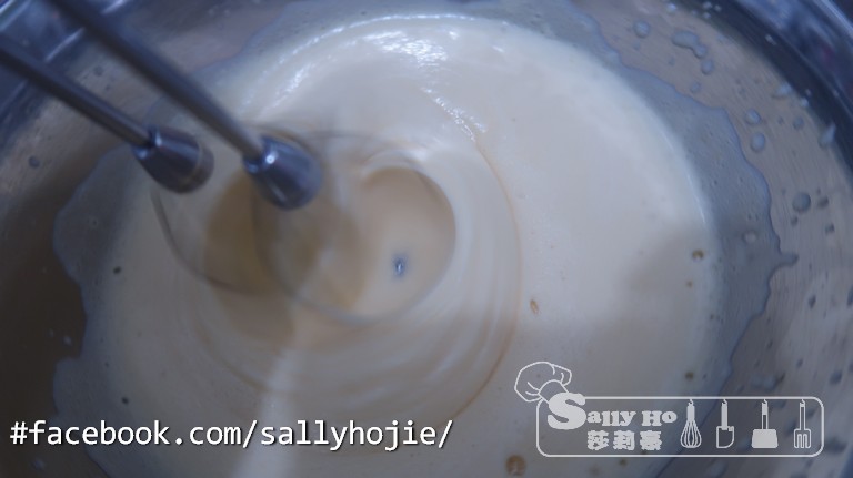 1) 蛋加砂糖拌勻,隔熱水用電動打蛋器打至蓬鬆狀態。