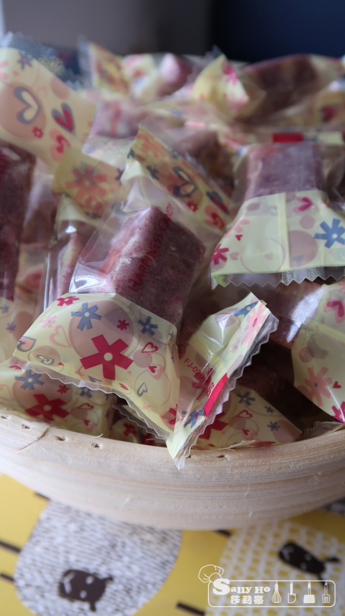 - 倒至不沾布上,手按幾下,加入草梅乾裝飾,壓平在糖盆內,放涼可切及入袋