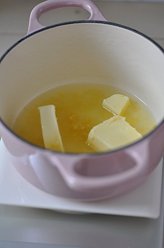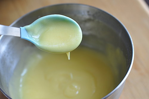 牛油、檸檬汁、檸檬皮煮滾,另一個盆把蛋及糖打至白色,