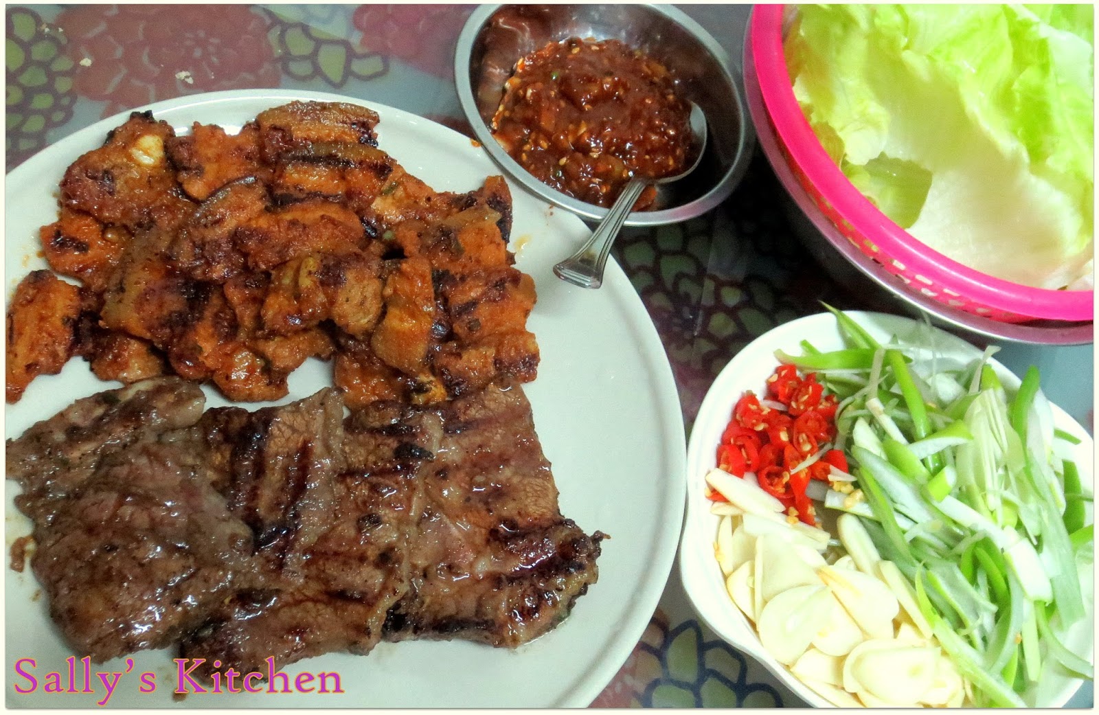 *食用時,配以綠色生菜包上牛仔骨肉,蒜片,辣椒粒,京蔥絲和韓式Ssamjang醬,風味更佳。