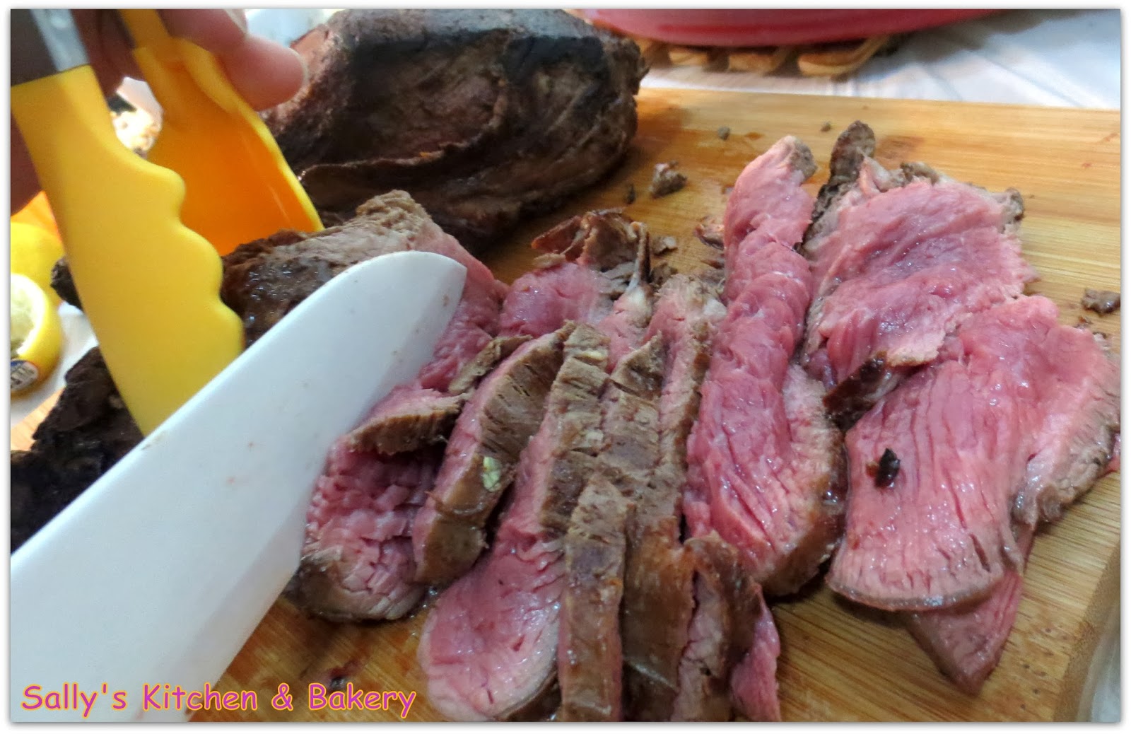 注意: 要讓煎好的牛肉最少鬆弛15分鐘才切片,好讓肉汁回流至牛肉各處,不然一切下肉汁便會流走。