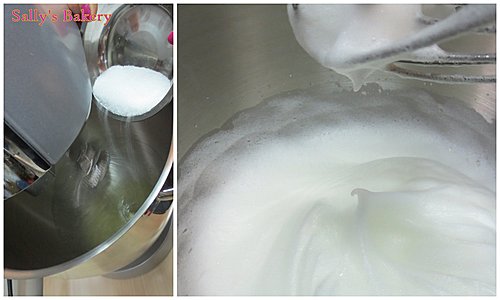 6. 蛋白用打蛋機打至起泡,加入2湯匙沙糖打至企身。