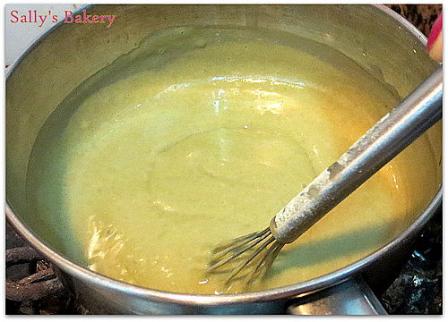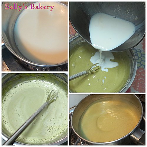 5. 將牛奶麵糊倒回小煲中,以極細火邊煮邊攪,一定要不停攪拌煮至杰身,備用。