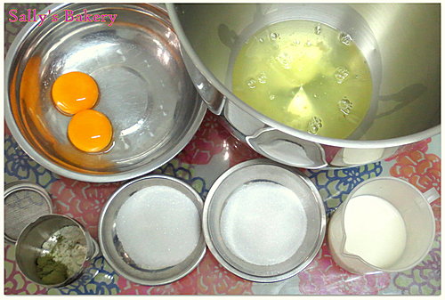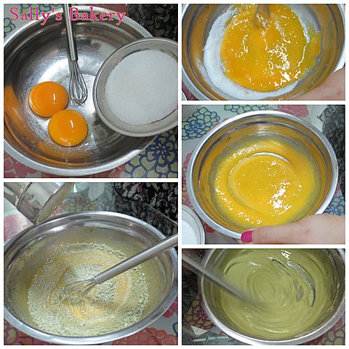 3. 蛋黃加入2 湯匙糖打至淡黃色,加入已篩好的麵粉及綠茶粉攪勻成糊狀。