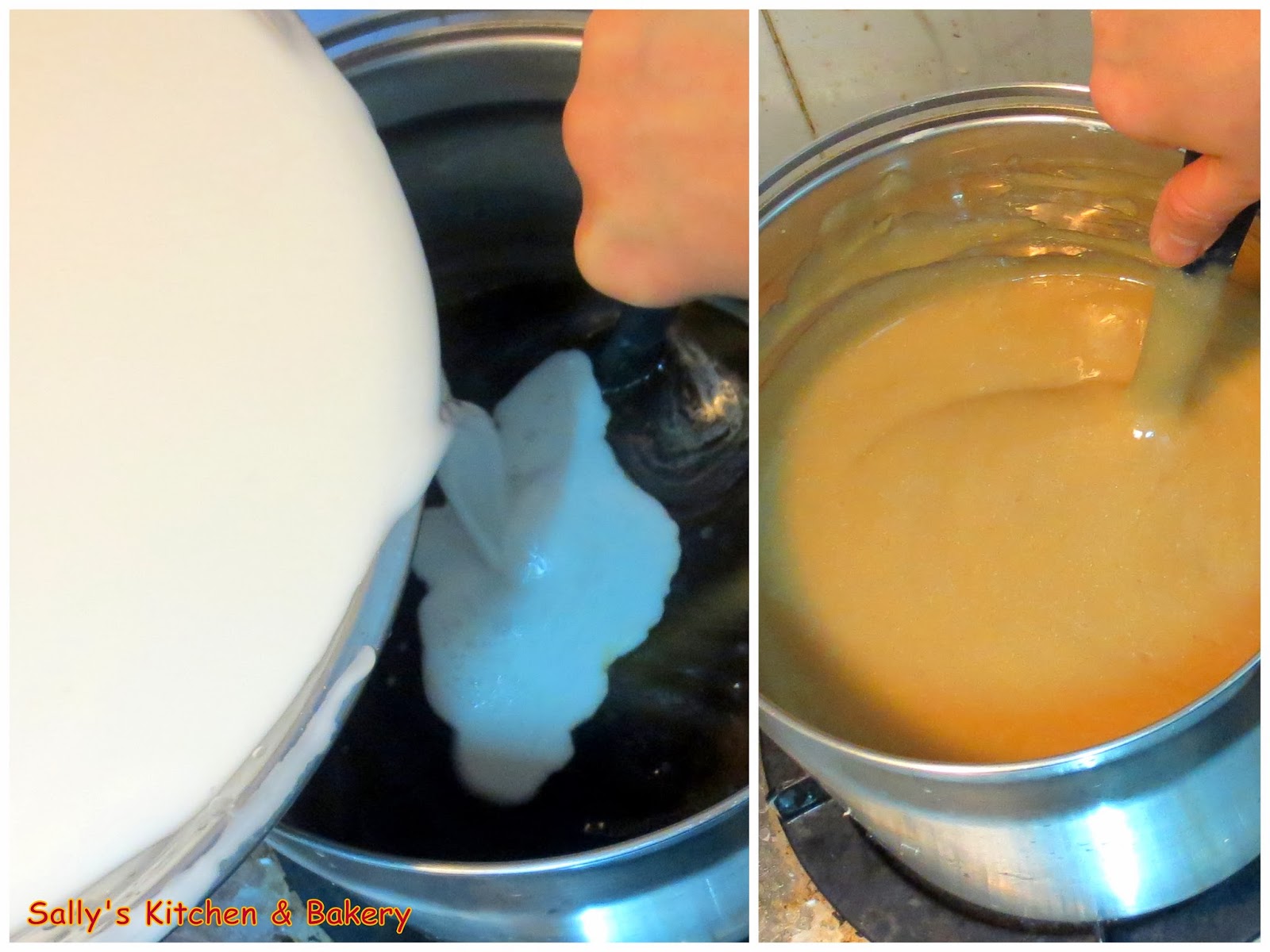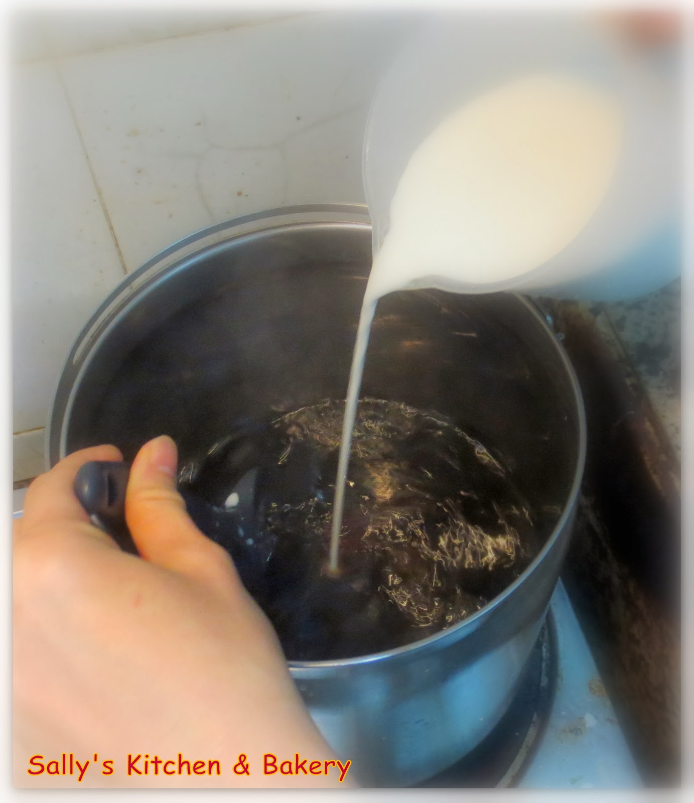 4. 然後加份約200ml馬碲粉漿細火煮勻後熄火,加入餘下的馬碲粉漿攪勻。