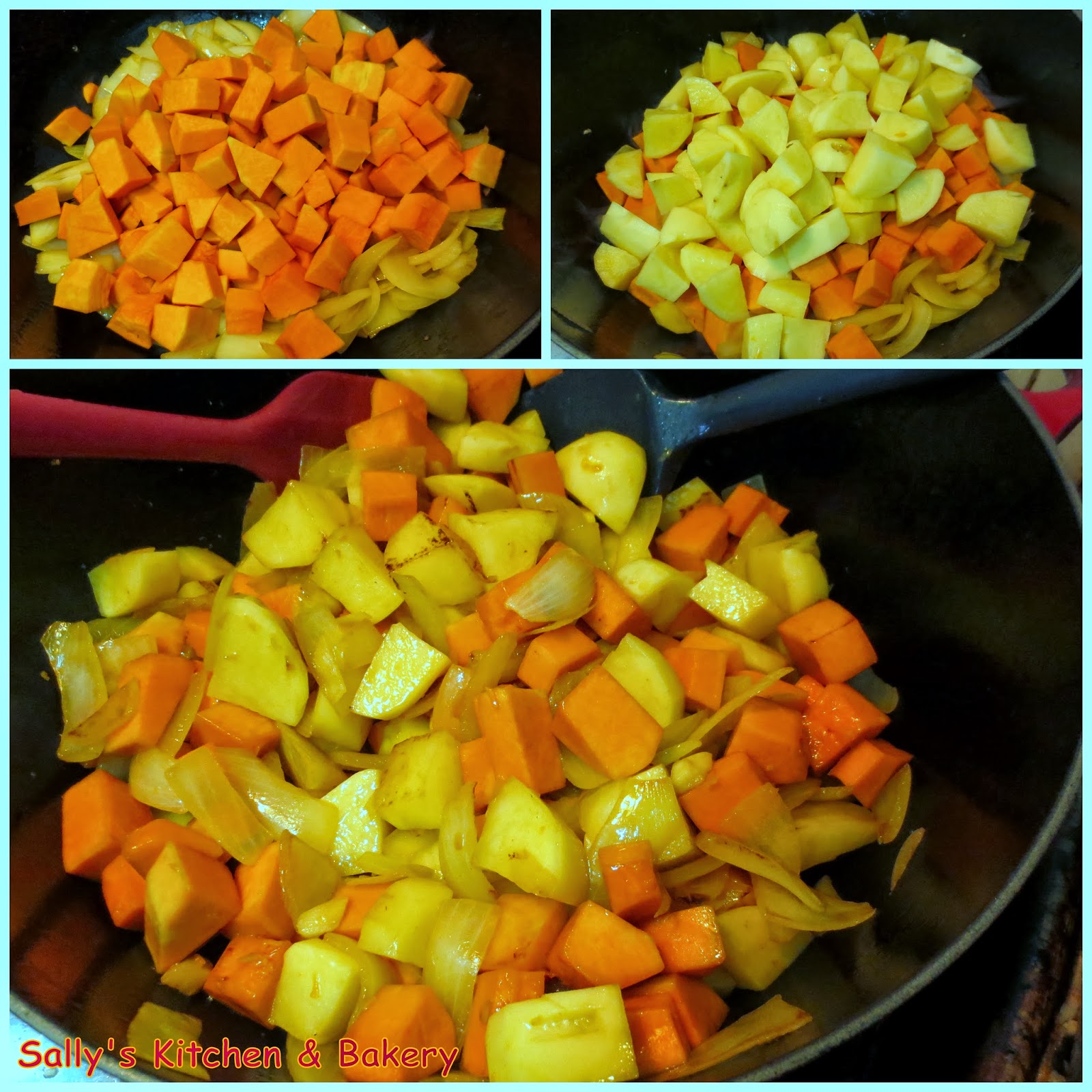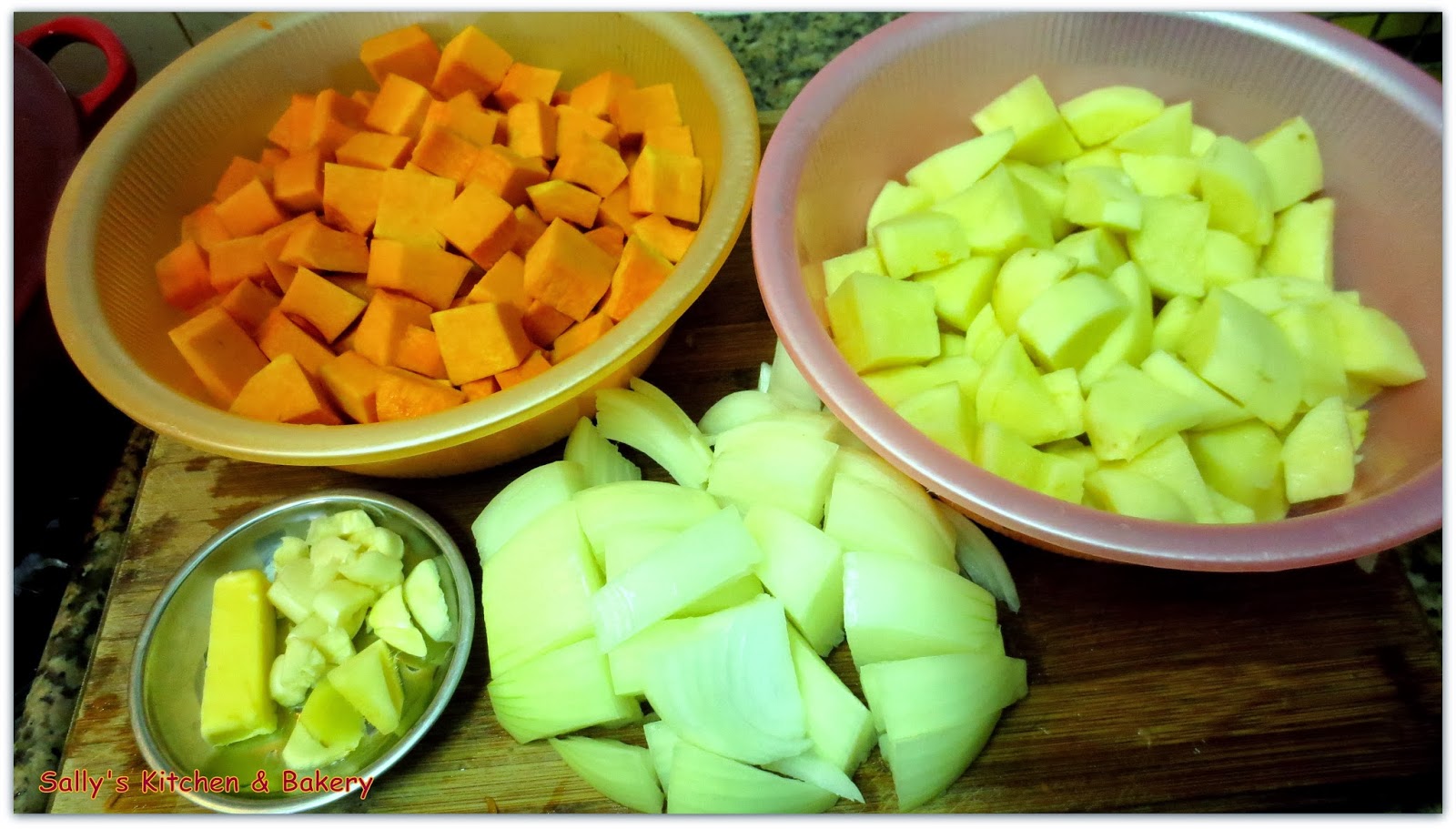 1. 南瓜洗淨去皮(南瓜皮很硬, 我用刀切去) ,去籽切粒,薯仔及洋蔥去皮切粒,備用。