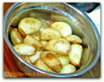 3. 用油先爆香蒜粒至少許金黃盛起備用。