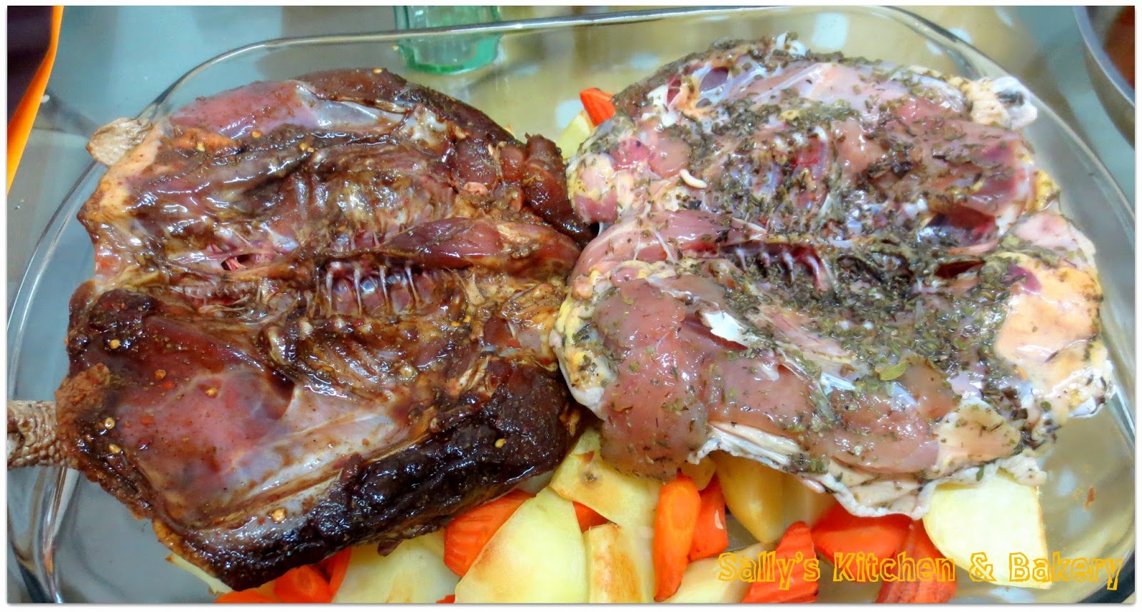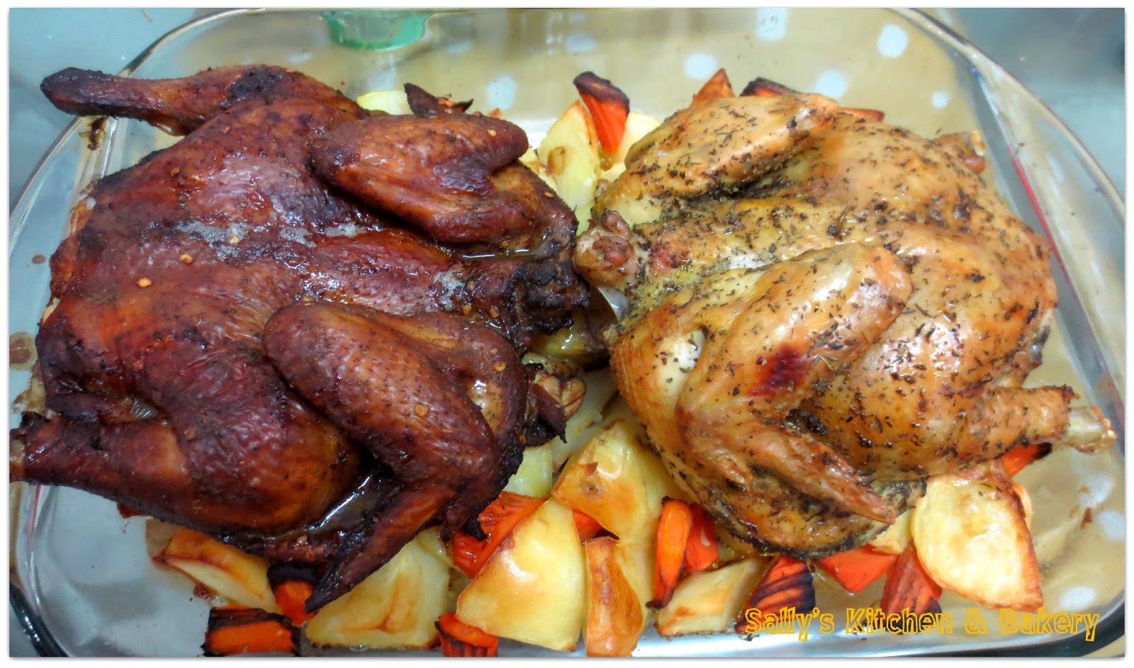 5. 先將薯仔甘荀放焗盤底入焗爐先焗20mins,取出放上雞。