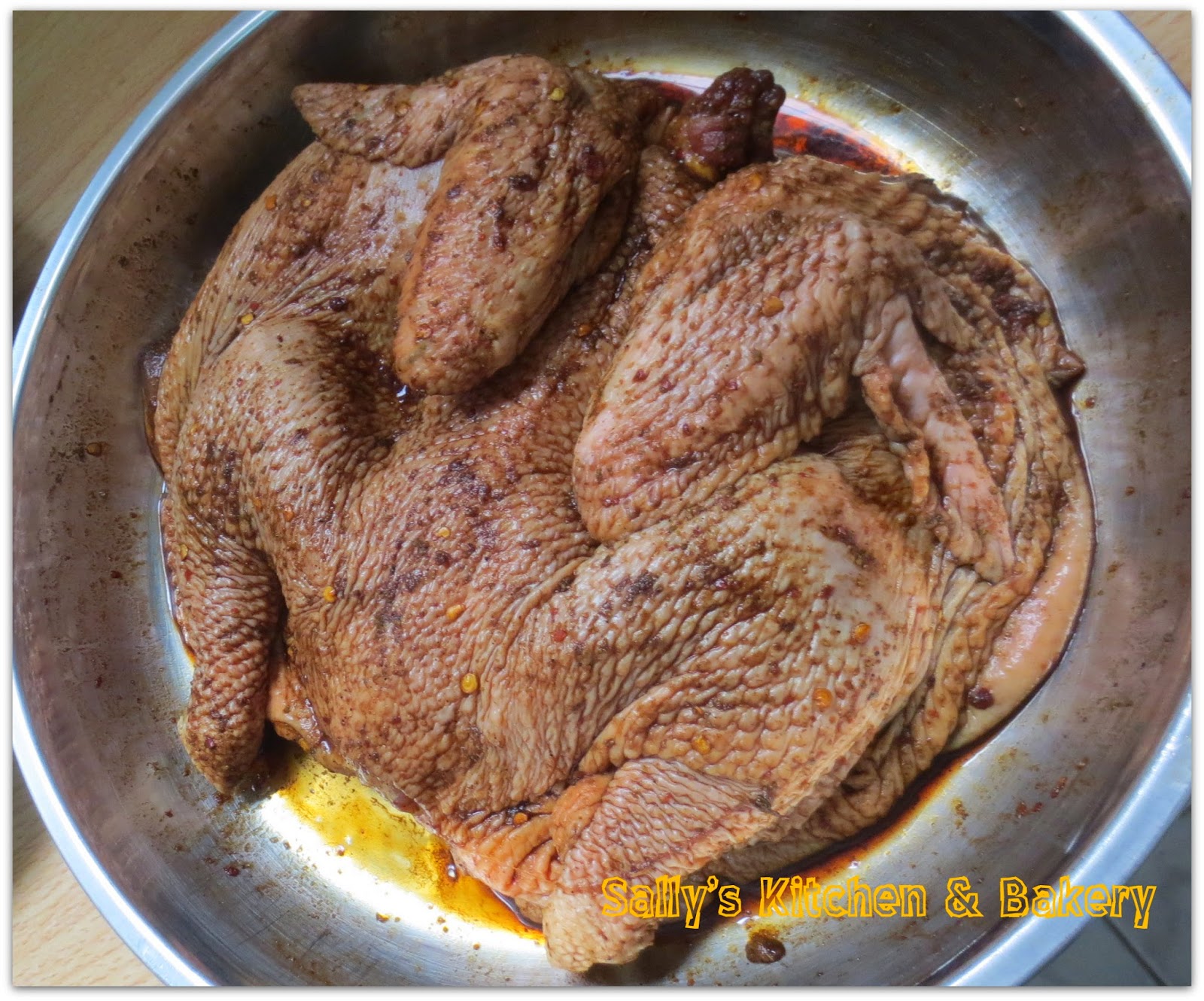 1. 雞洗淨抹乾,剪開雞肚,先用鹽"按摩"全雞,再加入其餘調味料"按摩"。