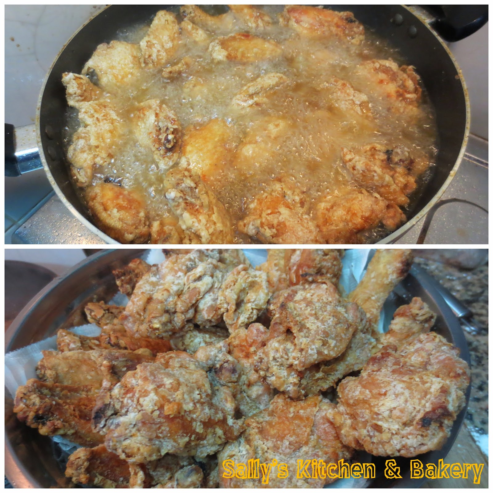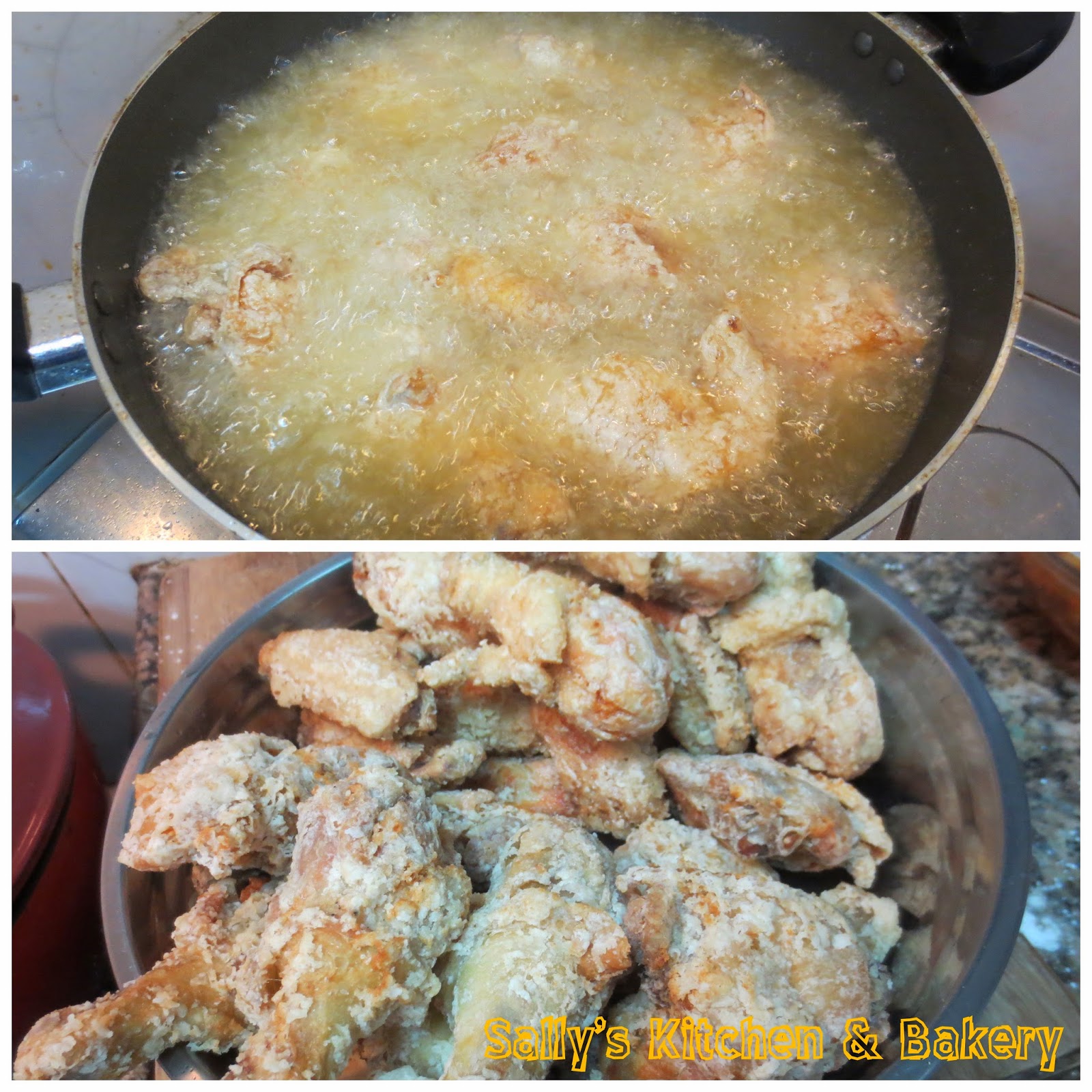 3. 準備炸鑊,倒進油,燒熱油約6-8分鐘,放入竹筷子即出大量泡泡代表油夠熱,逐一放入雞翼,中大火炸4-5分鐘,取出待涼2-3分鐘。