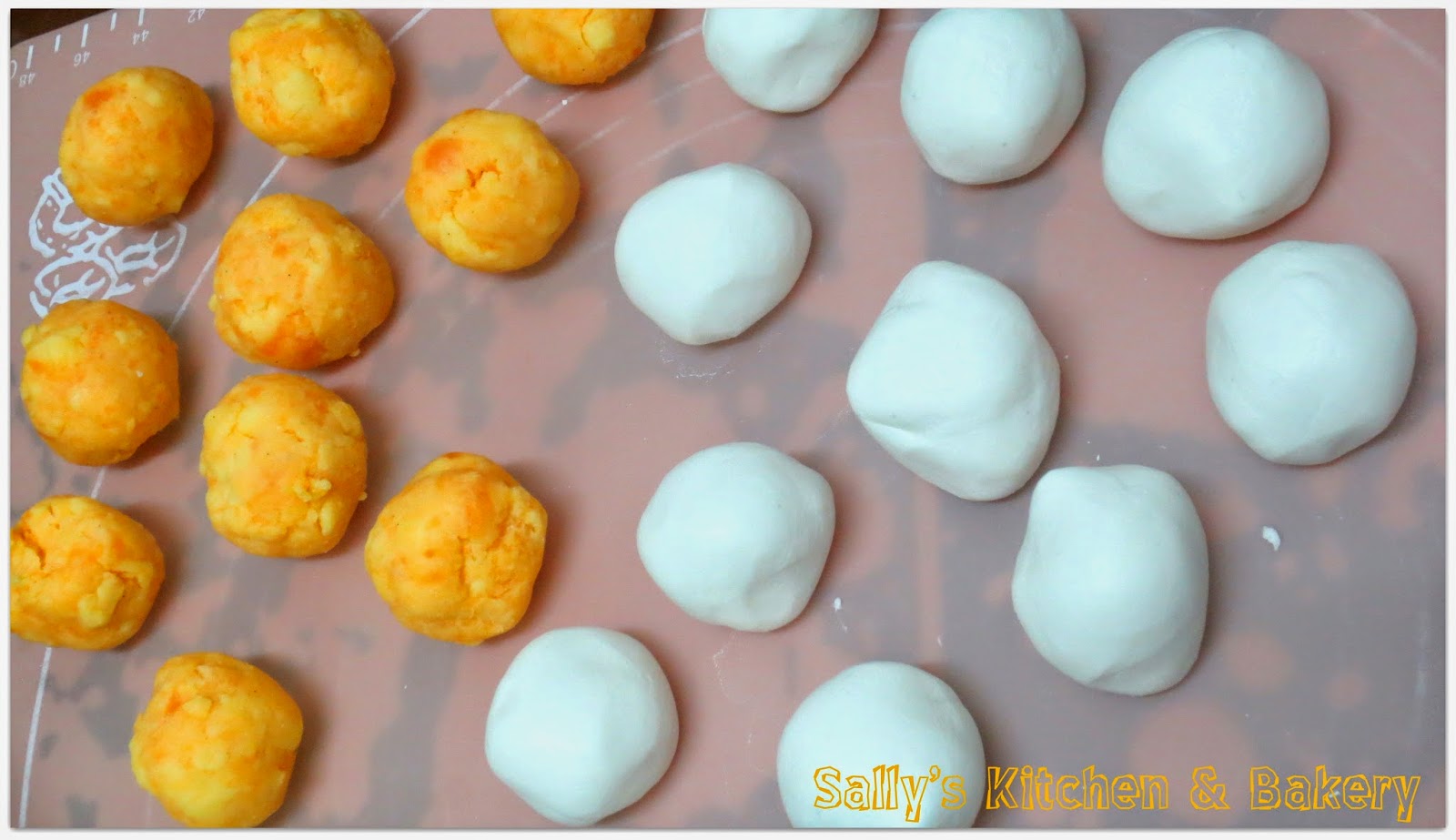 2. 將奶皇餡平勻分成十份,糯米粉糰亦是平勻分成十份。