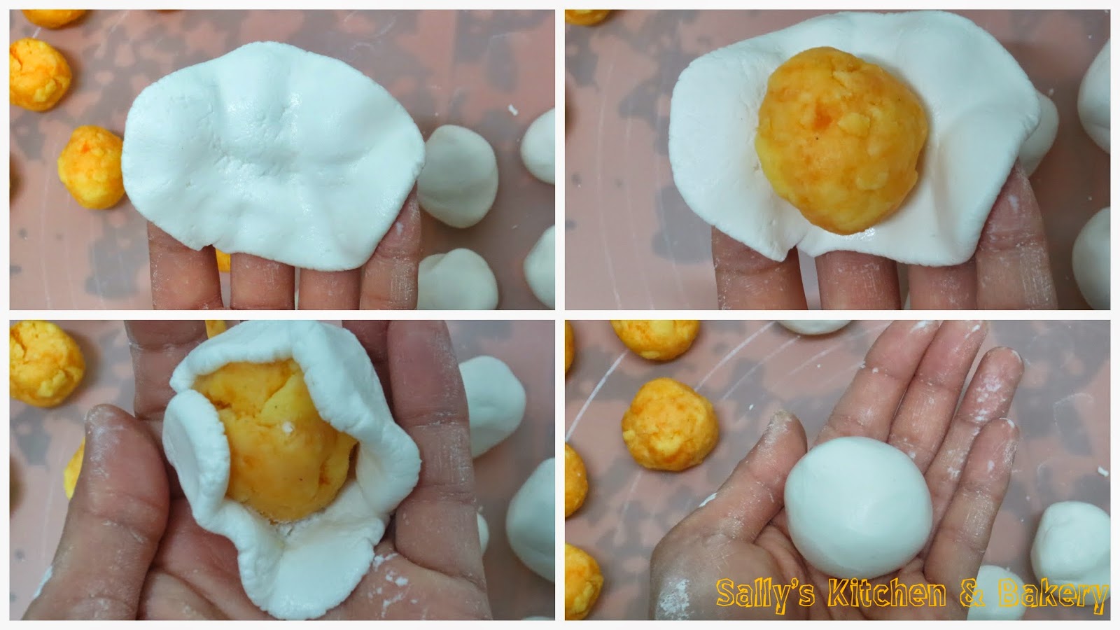 3. 用一份粉糰包入一粒奶皇餡,搓圓。<超級大粒, 珍寶Size啊!!>