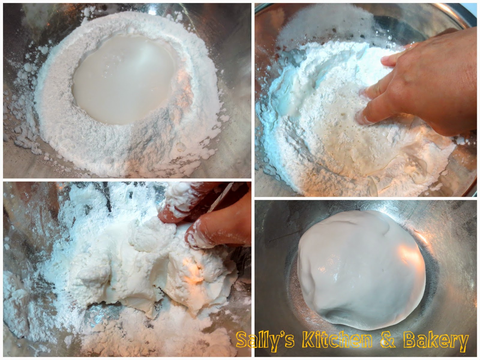 1. 先將糯米粉放進小盤中,加入95g水份,用手搓勻要完全搓勻才知道水份夠不夠的),覺得水份不夠便加入餘下的5g水份。搓好粉糰應該是不沾手,軟軟的。