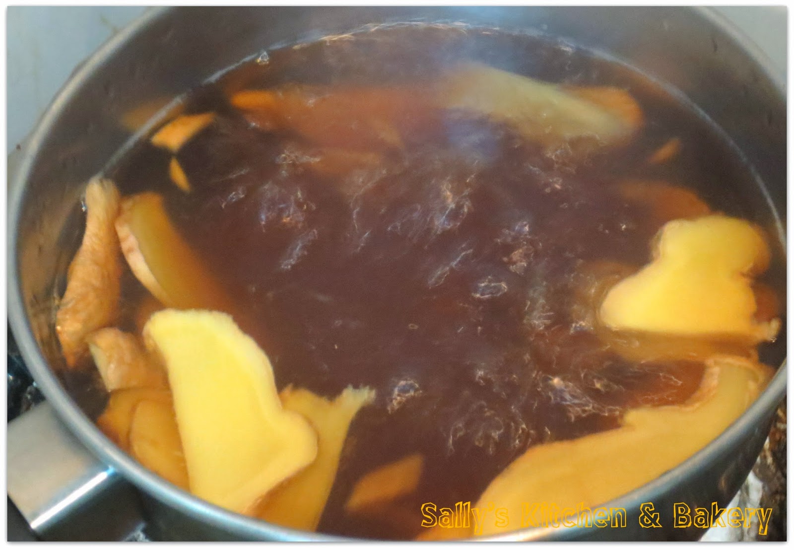 2. 黑糖薑湯: 薑放入500ml水中煮滾,轉細火煮5分鐘,加入黑糖煮溶便可。