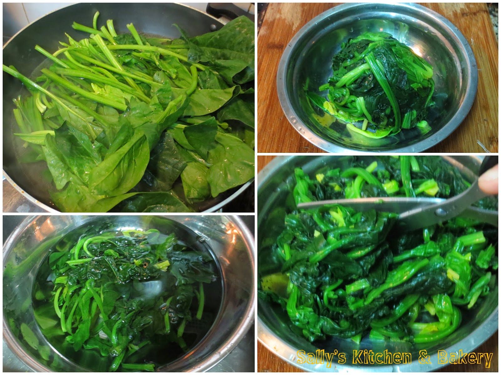 1. 先將菠菜洗淨,滾水灼1分鐘,隔去水份,過冷河,用手略榨乾水,切細備用。