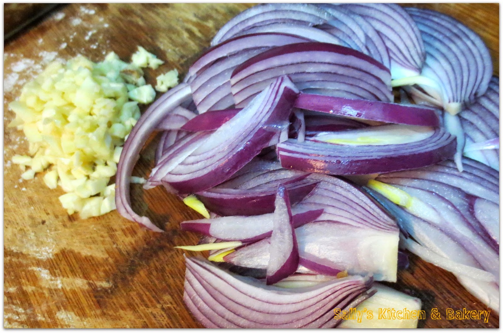 4. 洋蔥切絲,蒜粒切碎,甘荀切絲。