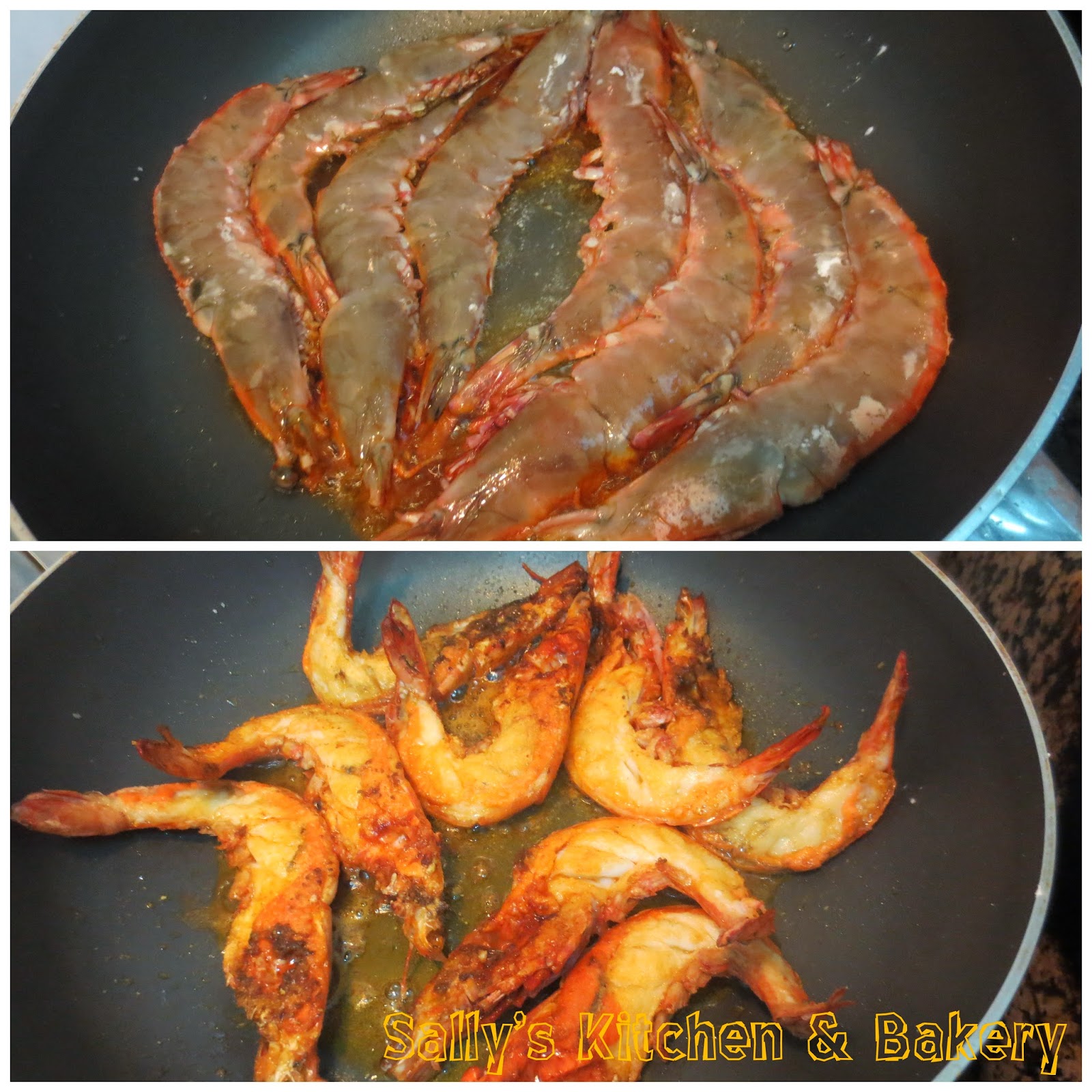 (煎蝦的時間要視乎蝦的大小,煎完蝦的油盛起留用。)