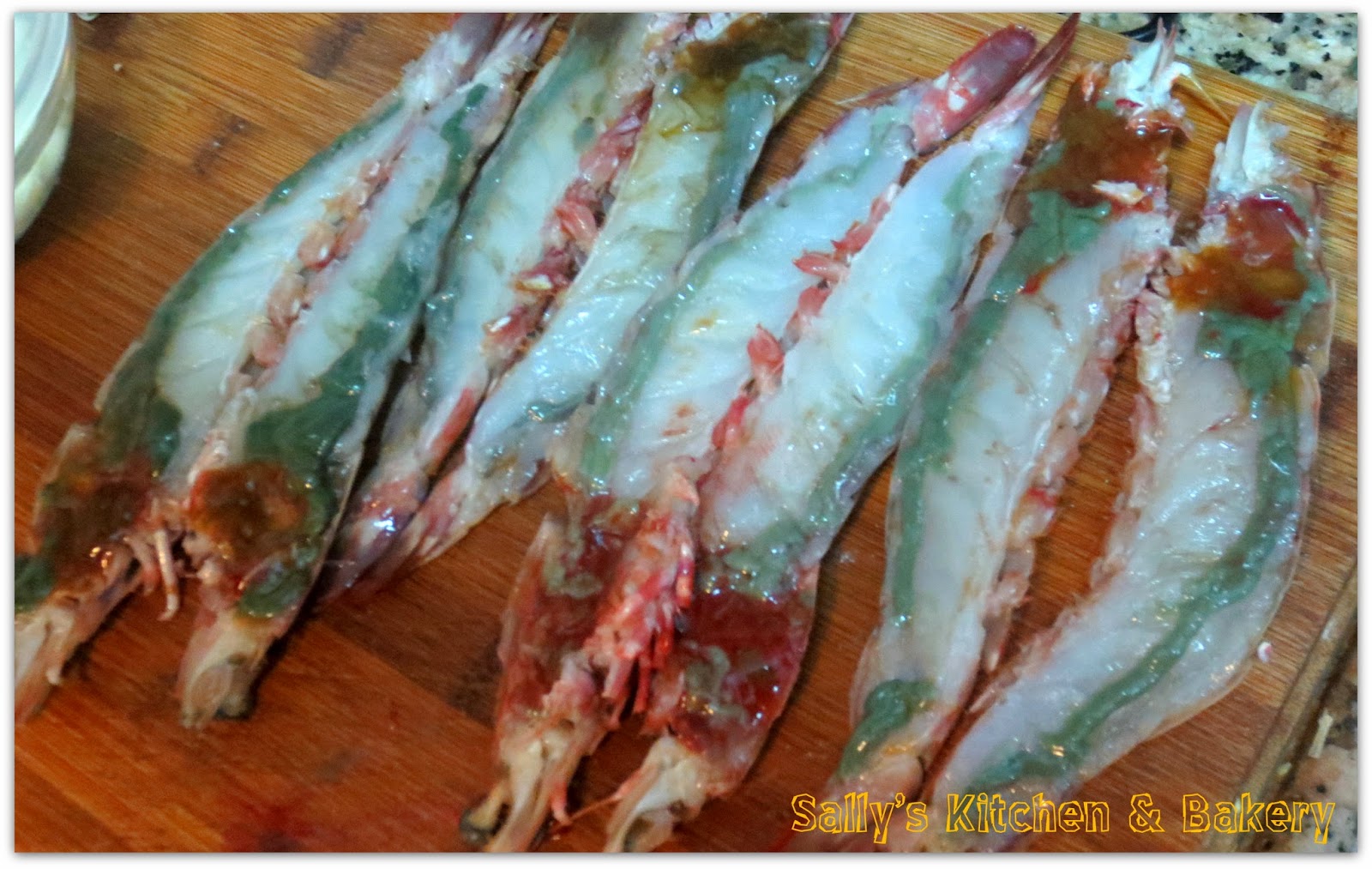 2. 大蝦洗淨,剪去蝦鬚及腳,開邊挑去蝦腸,灑上鹽及胡椒粉,拍上鷹粟粉。