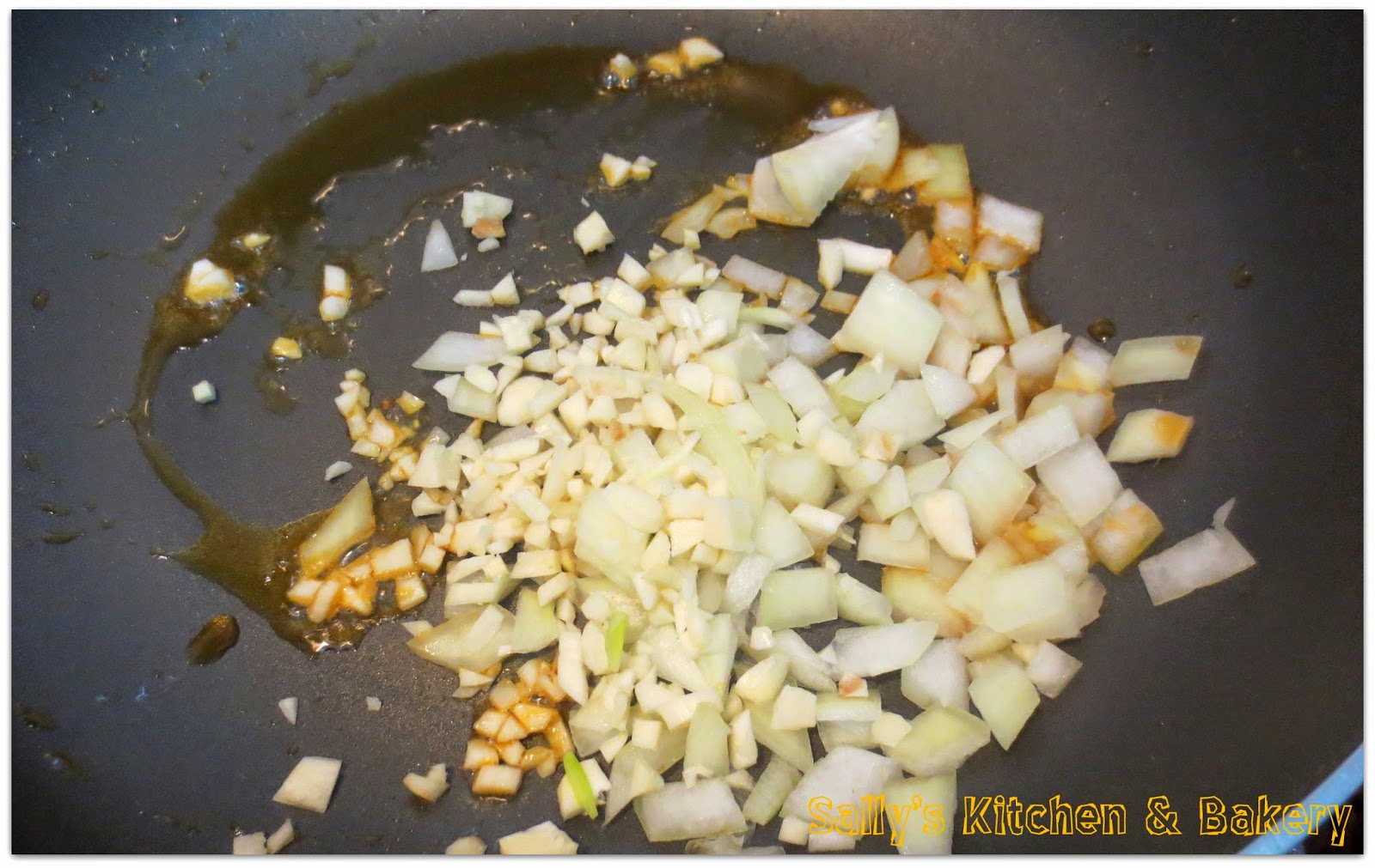 4. 鑊不用洗,用廚房紙抹走雜質,加入約1湯匙煎完蝦的油,炒香蒜粒及洋蔥粒,約2分鐘。