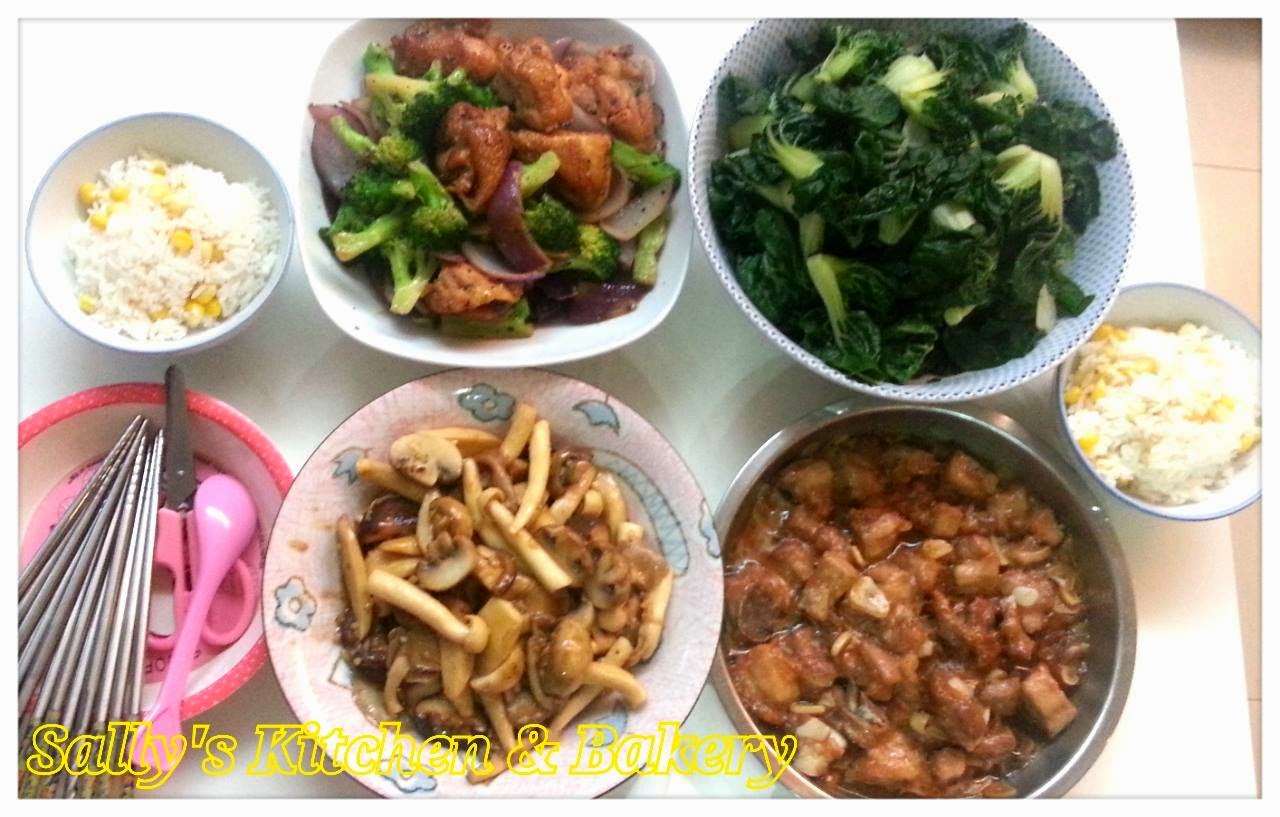 蒸排骨,灼白菜,洋蔥西蘭花炒雞扒,蒜香炒雜菇