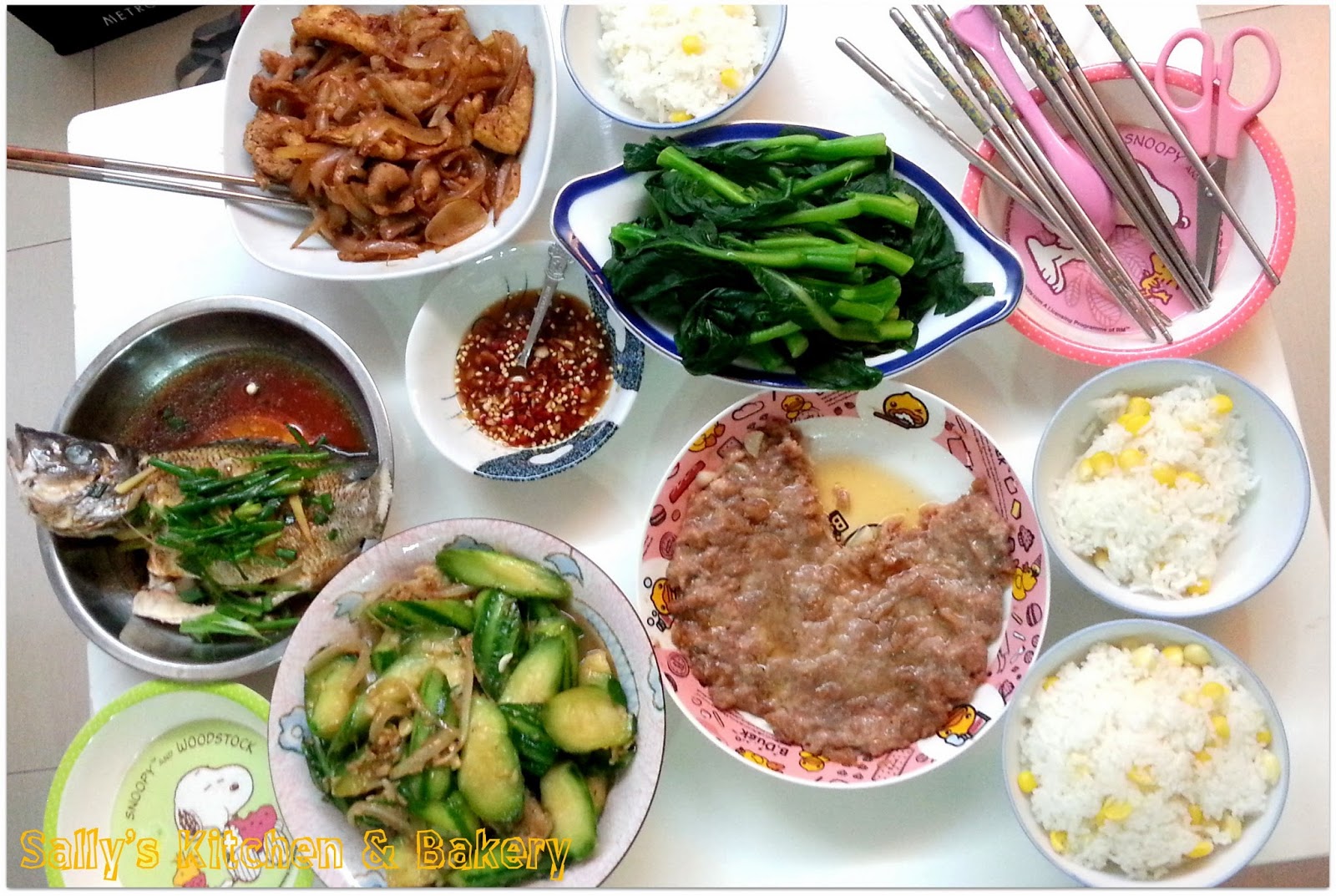 洋蔥豆卜炒豬頸肉,魚鬆炒勝瓜,梅菜蒸肉餅,蒸魚,白灼菜心苗