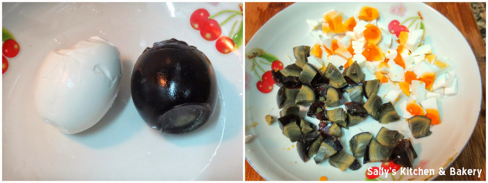 1. 先將咸蛋皮蛋去泥洗淨,放入煲連凍水中火煲滾,水滾轉細火煲10分鐘。
