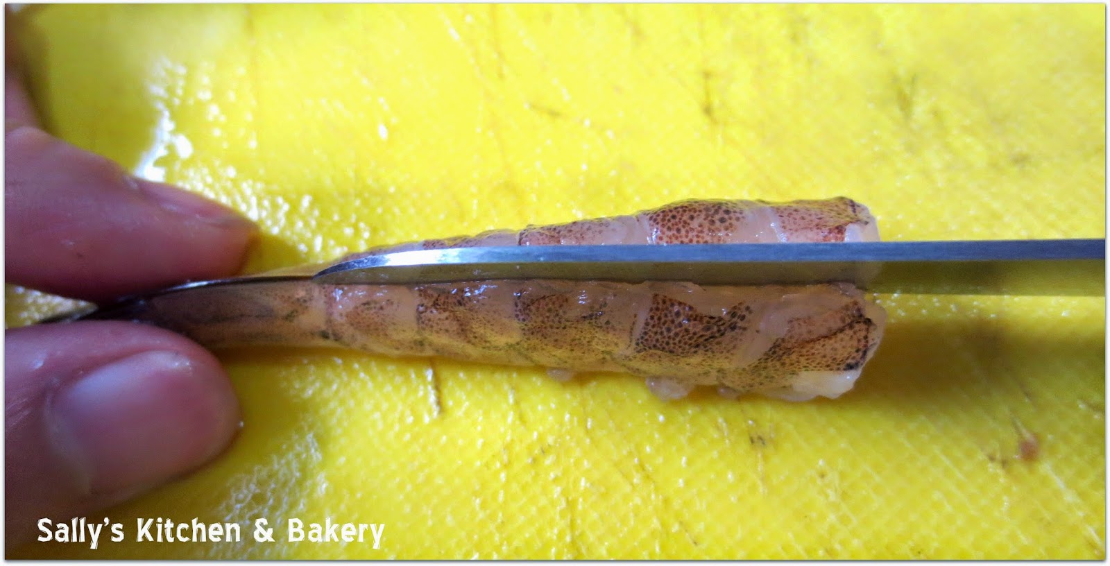 7. 將已去殼的蝦在背部開邊,不要切到底,去腸 ,再放入冰水中浸泡5-10分鐘。
