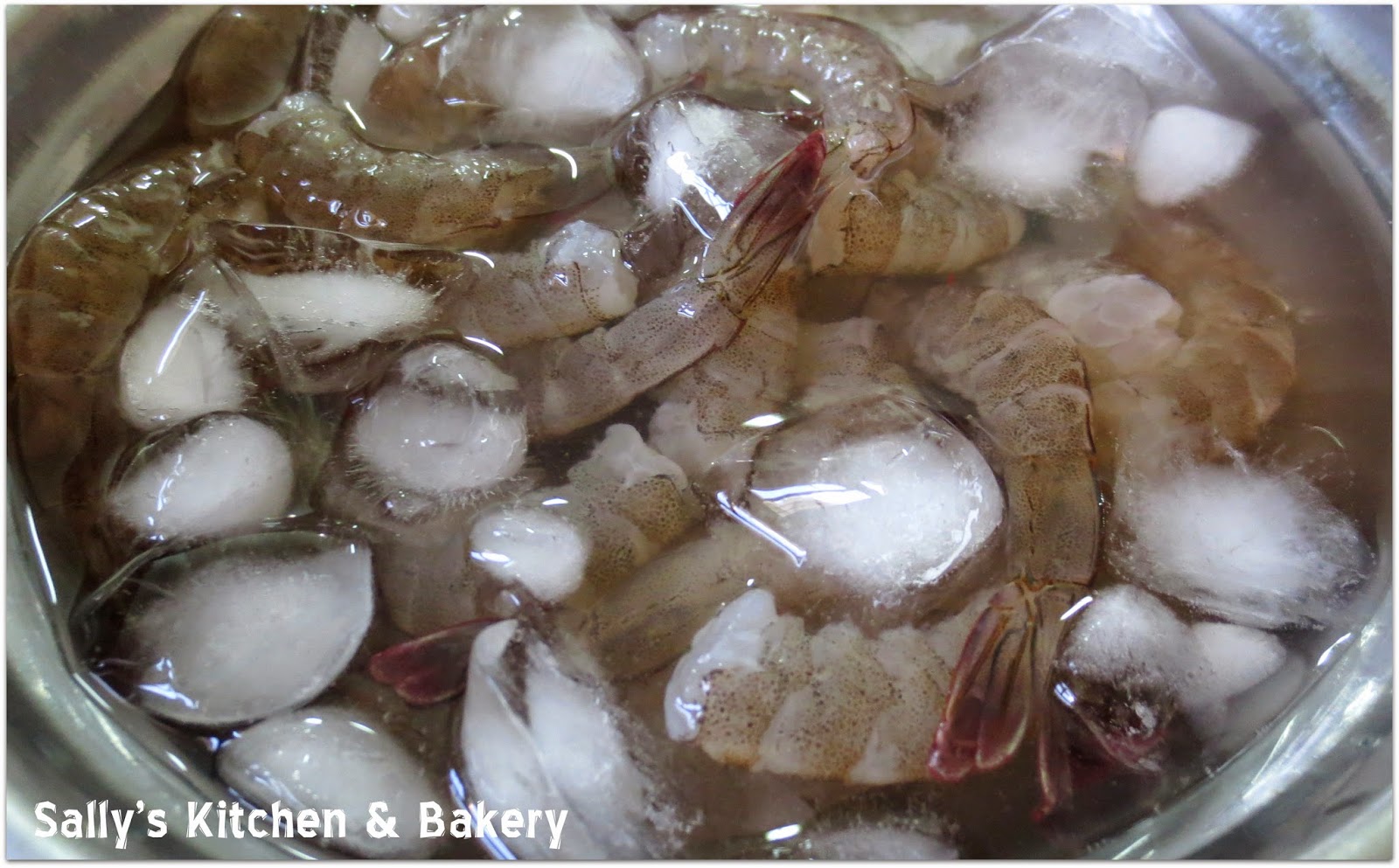 2. 準備1湯碗冰,加入少許飲用水,放入已洗淨海蝦浸5-10分鐘。