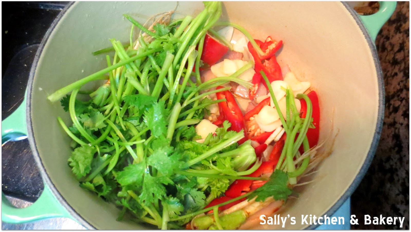 3. 下乾蔥頭、 蒜片、大紅椒、指天椒和莞茜根部,炒香約2分鐘。