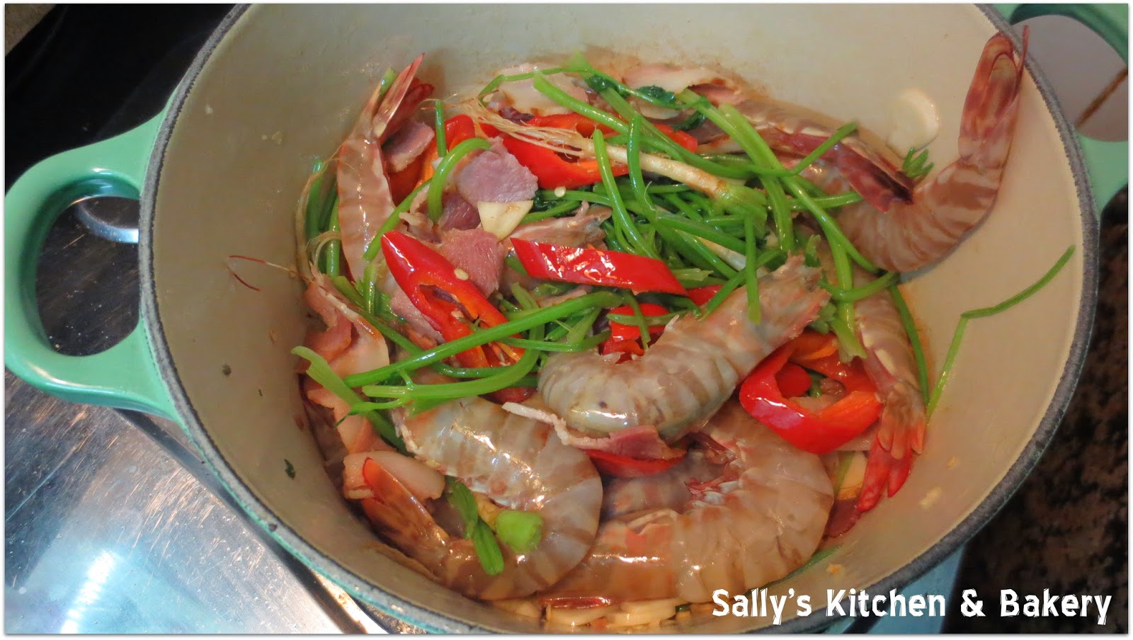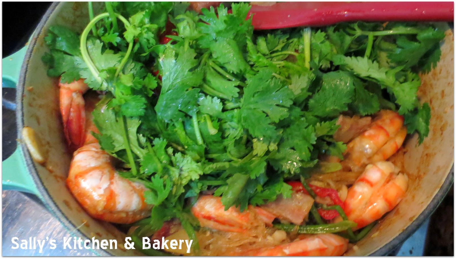 1. 大蝦洗淨去腸,抹乾備用。粉絲浸軟待用。莞茜洗淨, 分開根部及葉,切碎。乾蔥頭切碎。蒜頭切片,大紅椒切細。