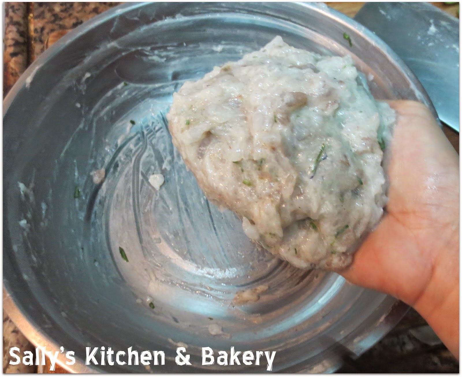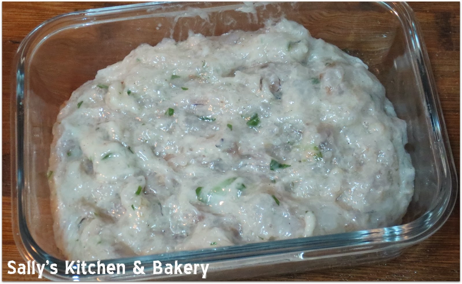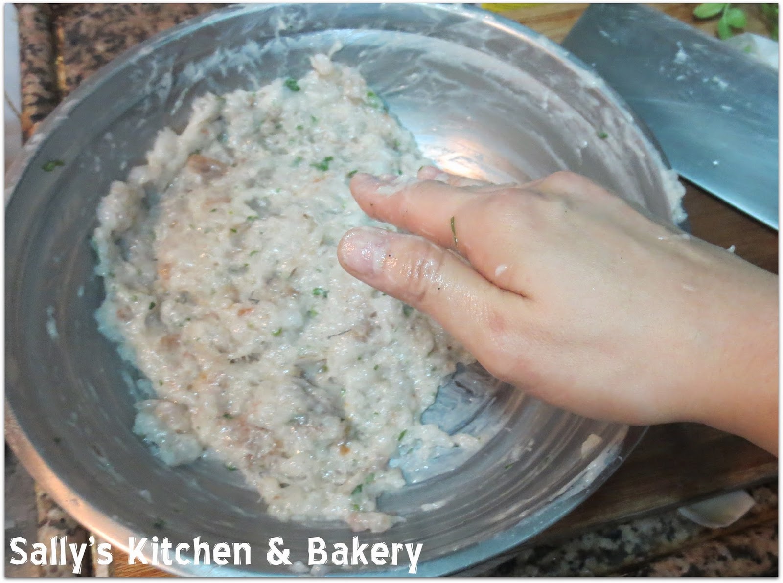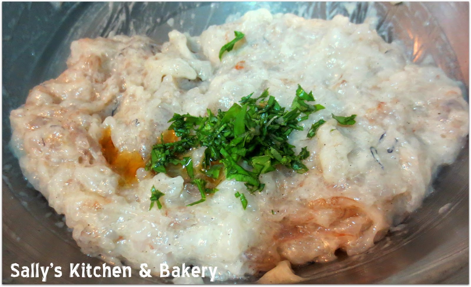 3. 加入調味料(除九層塔及麻油),順一個方向攪拌均勻,再加入九層塔碎及麻油攪拌均勻至起膠。