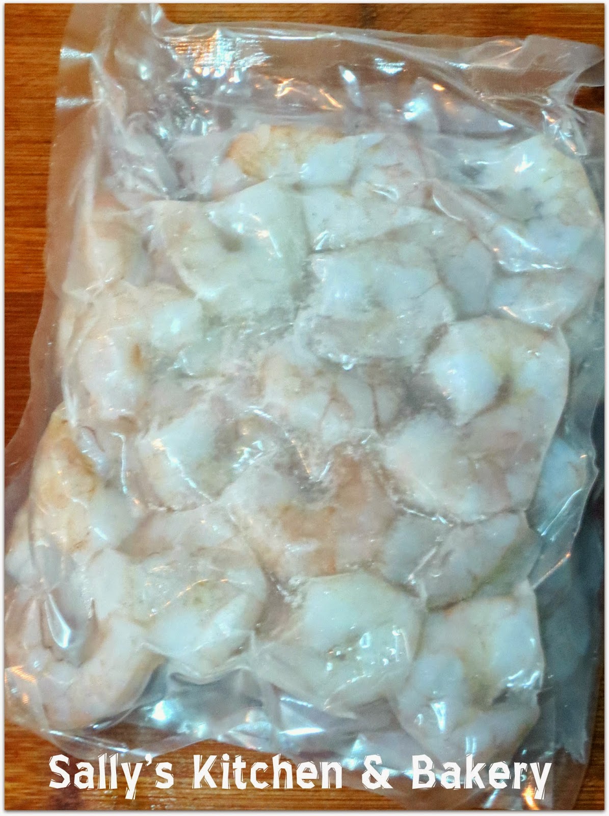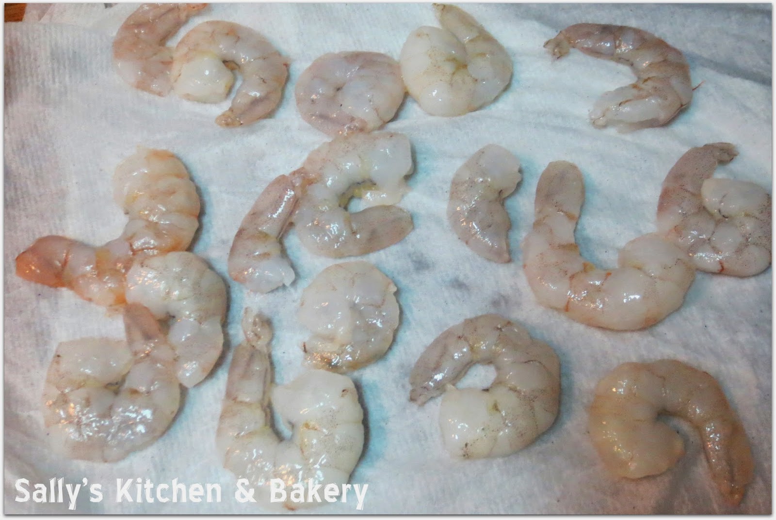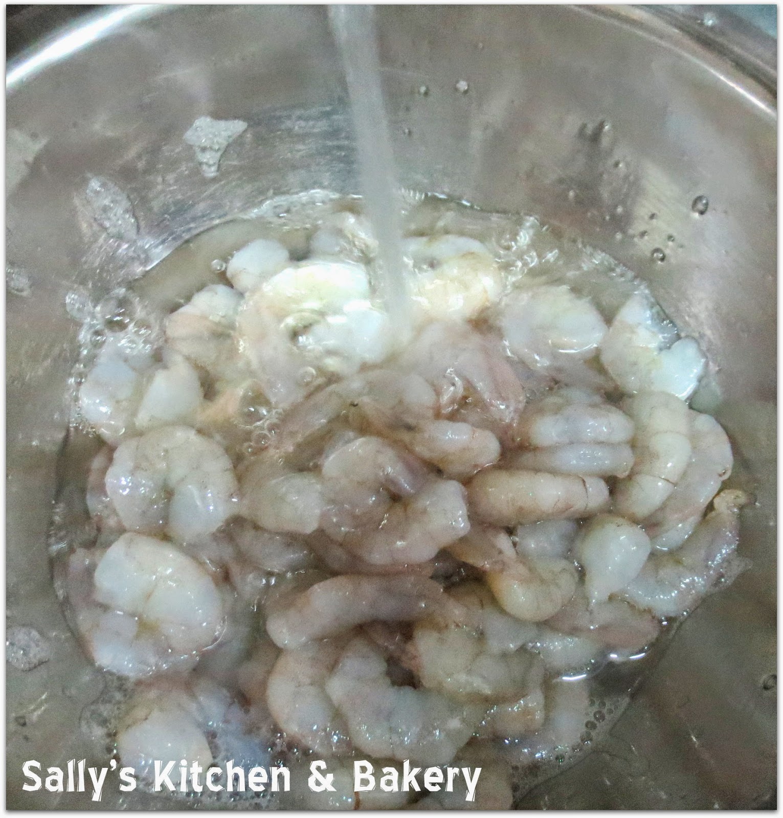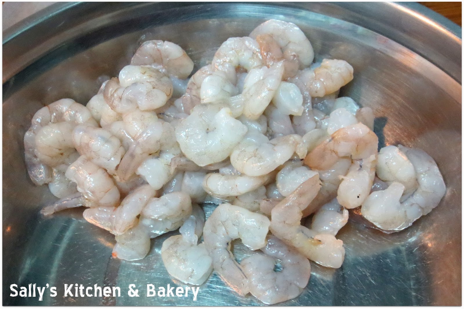 1. 先將急凍蝦仁解凍,加入1茶匙鹽(材料外)加水洗淨,抹乾。