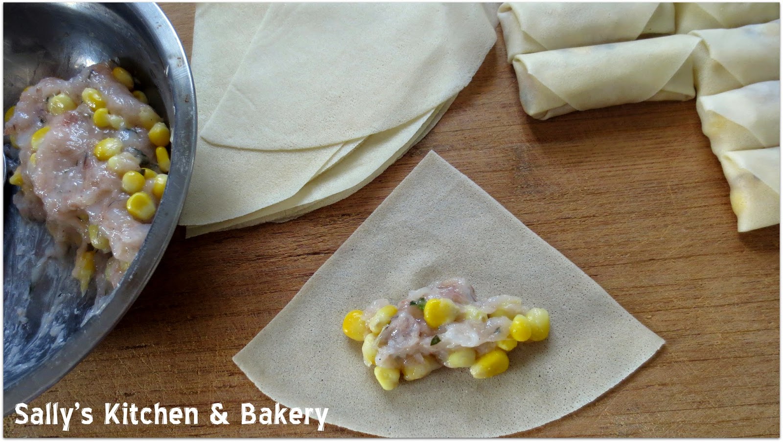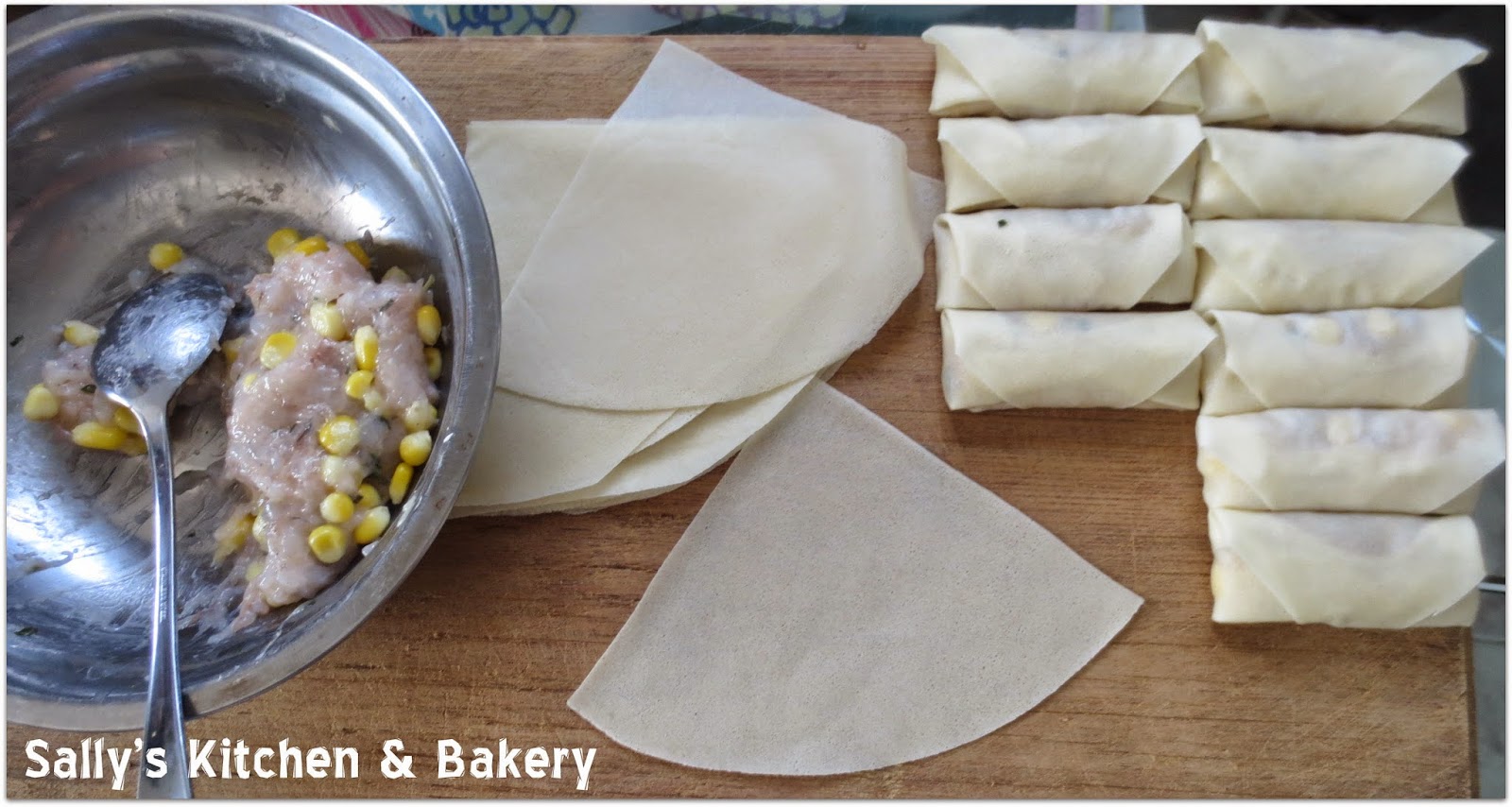 1. 將蝦膠及粟米粒拌勻,放一小匙在上春卷皮上,捲實,用小量蝦膠或生粉水封口。逐一包好春卷直至用完所有蝦膠。