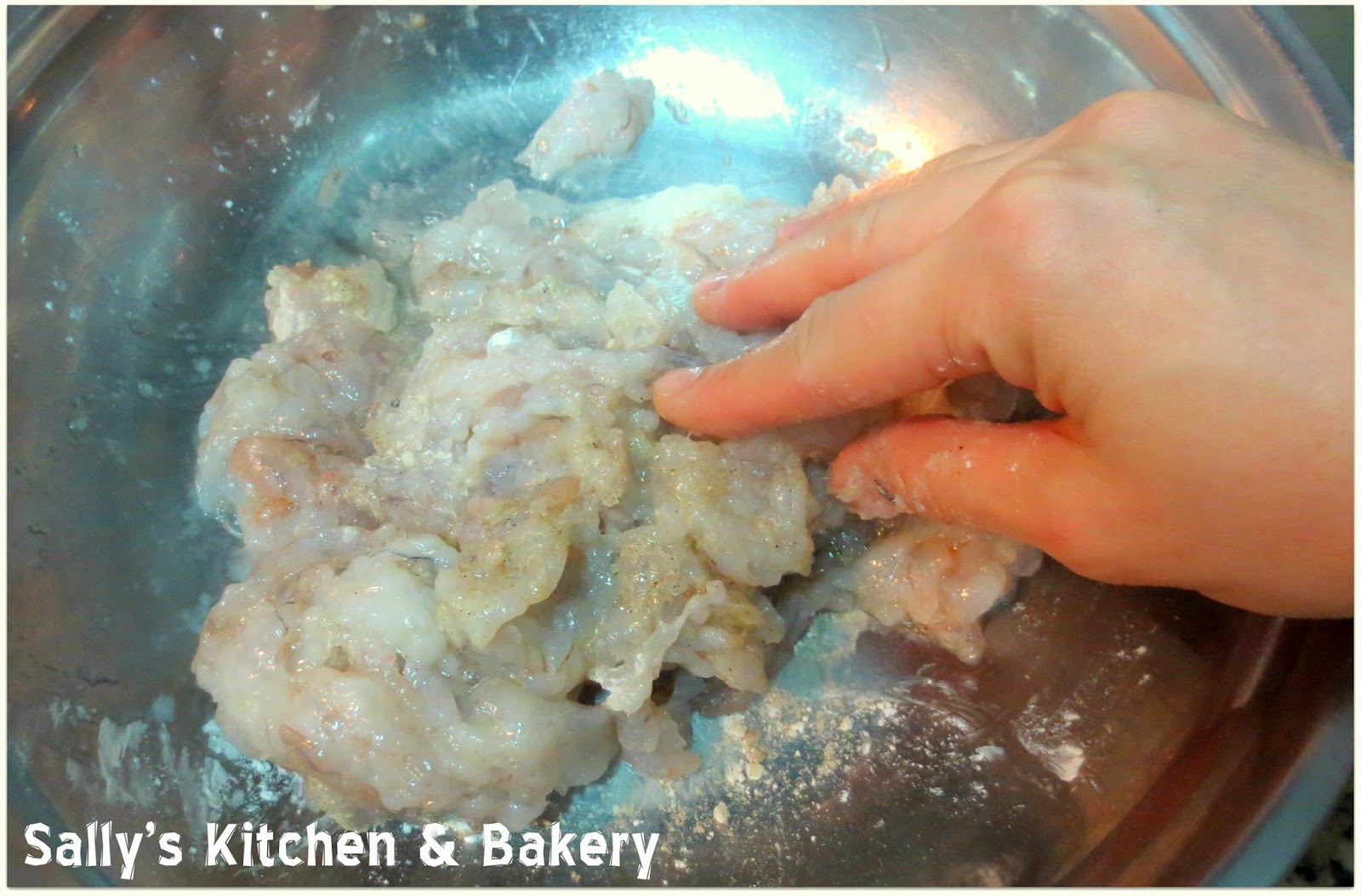 4. 然後整糰蝦膠放在手中提起,再撻回大碗中,一共撻二十多次。