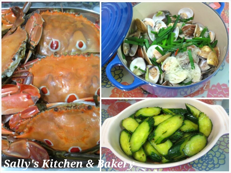昨天的晚餐: 清蒸三點蟹, 蔥蒜粉絲煮大蜆, 淺漬青瓜 (食譜重溫)
