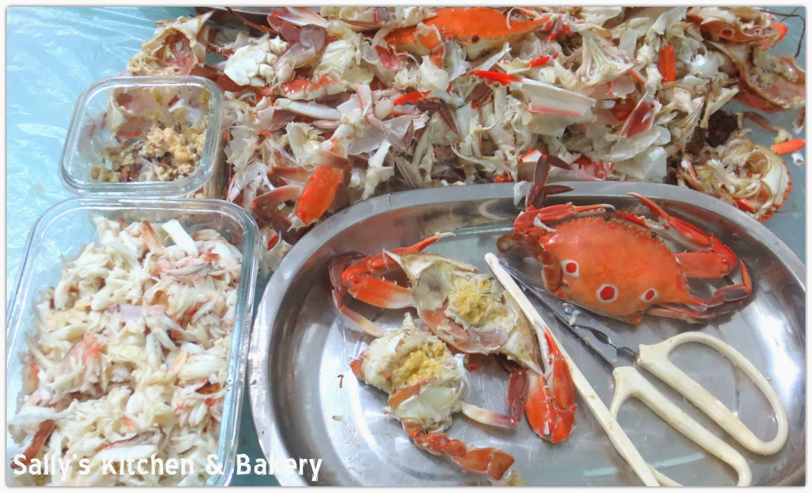 1. 花蟹洗淨,隔水蒸15分鐘或至熟,放涼拆肉,分開蟹肉及蟹膏,備用。