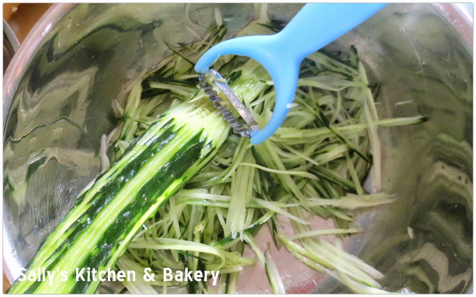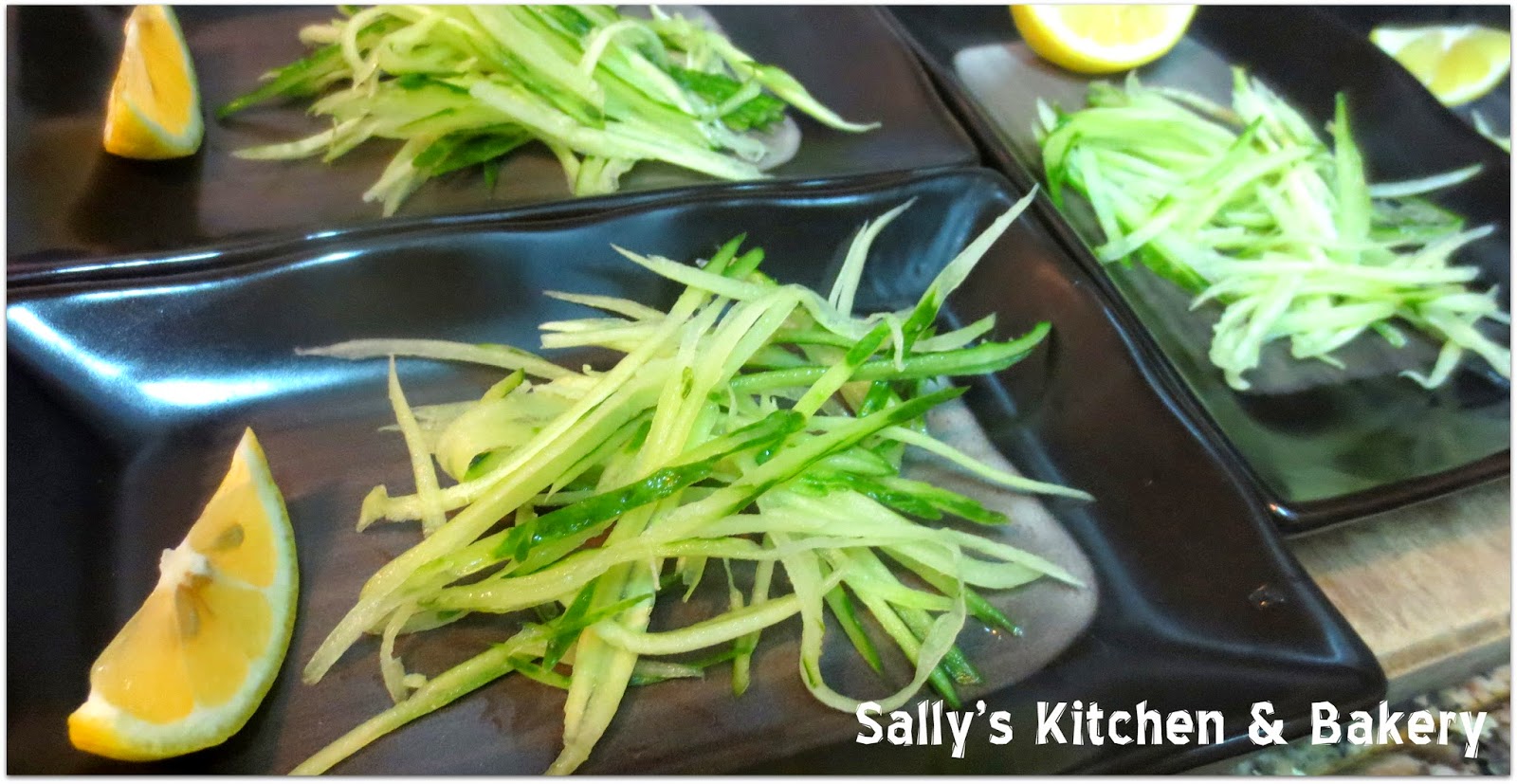 2. 青瓜刨成絲,放雪櫃備用。 檸檬洗淨,切為6小份,備用。