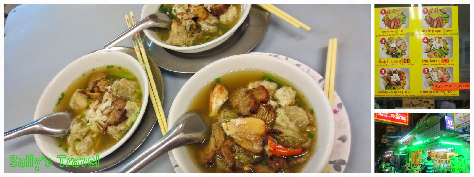 其實這裡的選擇不多,只有6款食品,她的雲吞及湯也做得不錯,我上次來到已試過了蟹鉗麵,所以今次我跟相公點了3號蟹肉叉燒雲吞湯(100baht/碗), 蟹鉗麵的蟹鉗大小不同價,朋友點了6號的叉燒雲吞蟹鉗麵,要250baht份量的。湯真的不錯,給我們喝個清光,哈~
