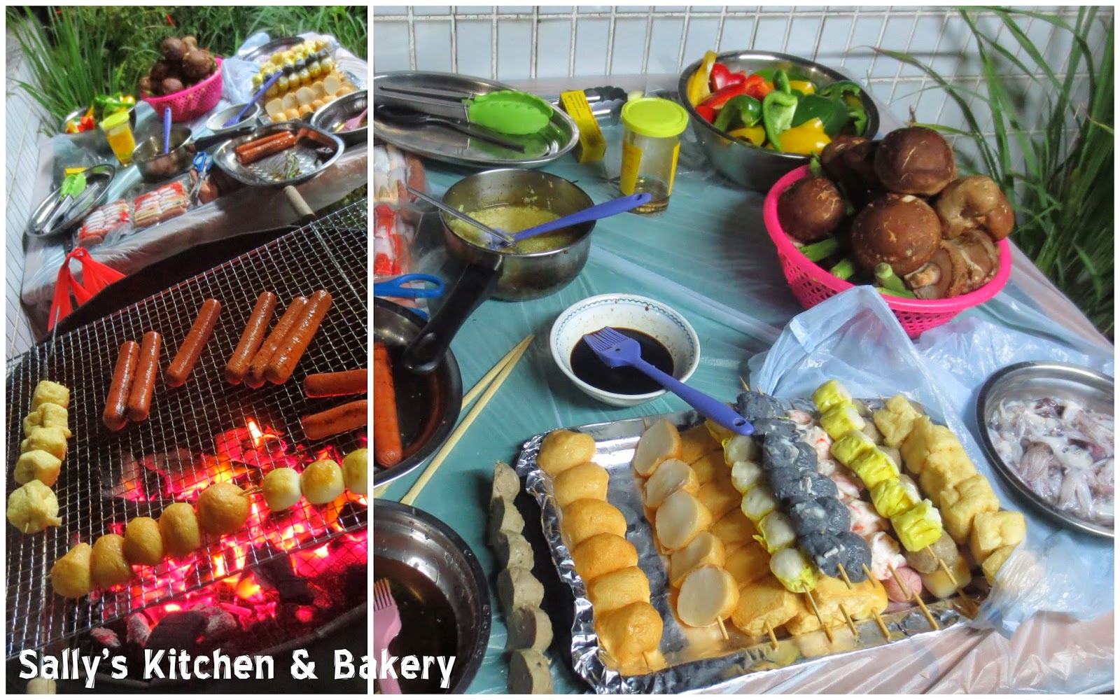 1pm回到家便洗洗洗切切切醃醃醃及準備食物。要做的是把丸類洗好切好串好,雞翼豬頸肉牛仔骨洗好醃好,燒牛肉要煎好,忌廉生日蛋糕要做好,沙律都要切好撈好,要做好香蒜包&Pizza包。。。。趕得到在4:30pm左右完成!!!! 真的是快速無敵摩打手出動!!! 哈哈~