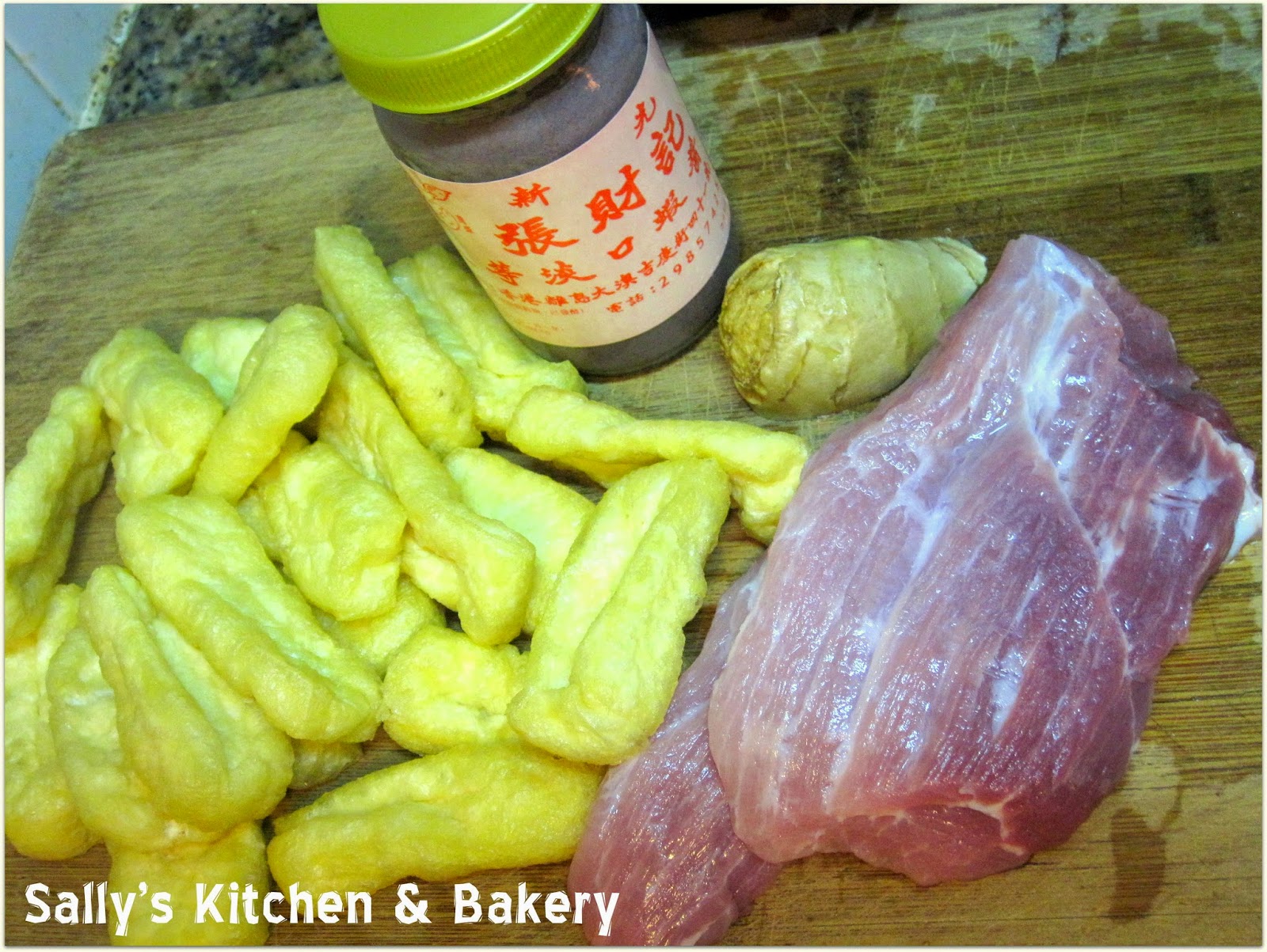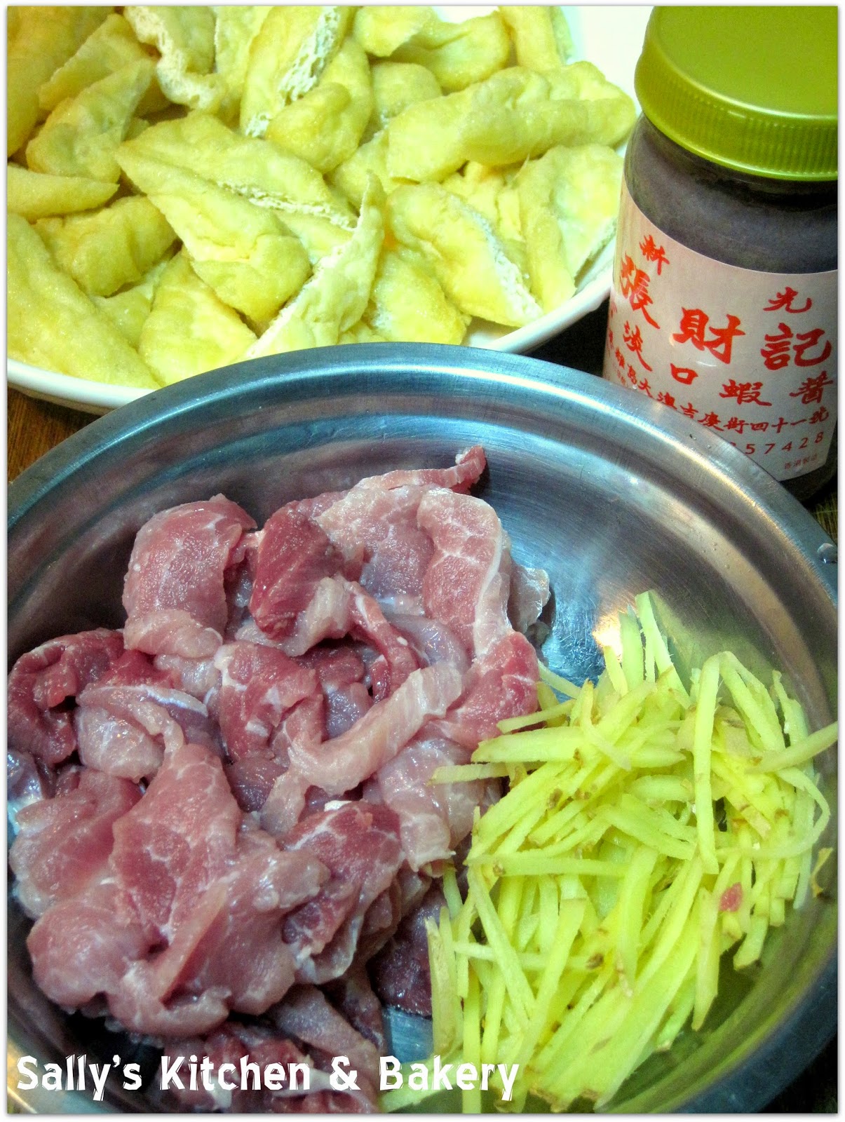 1. 豬肉洗淨,切片。薑片切絲。豆卜洗淨切半。