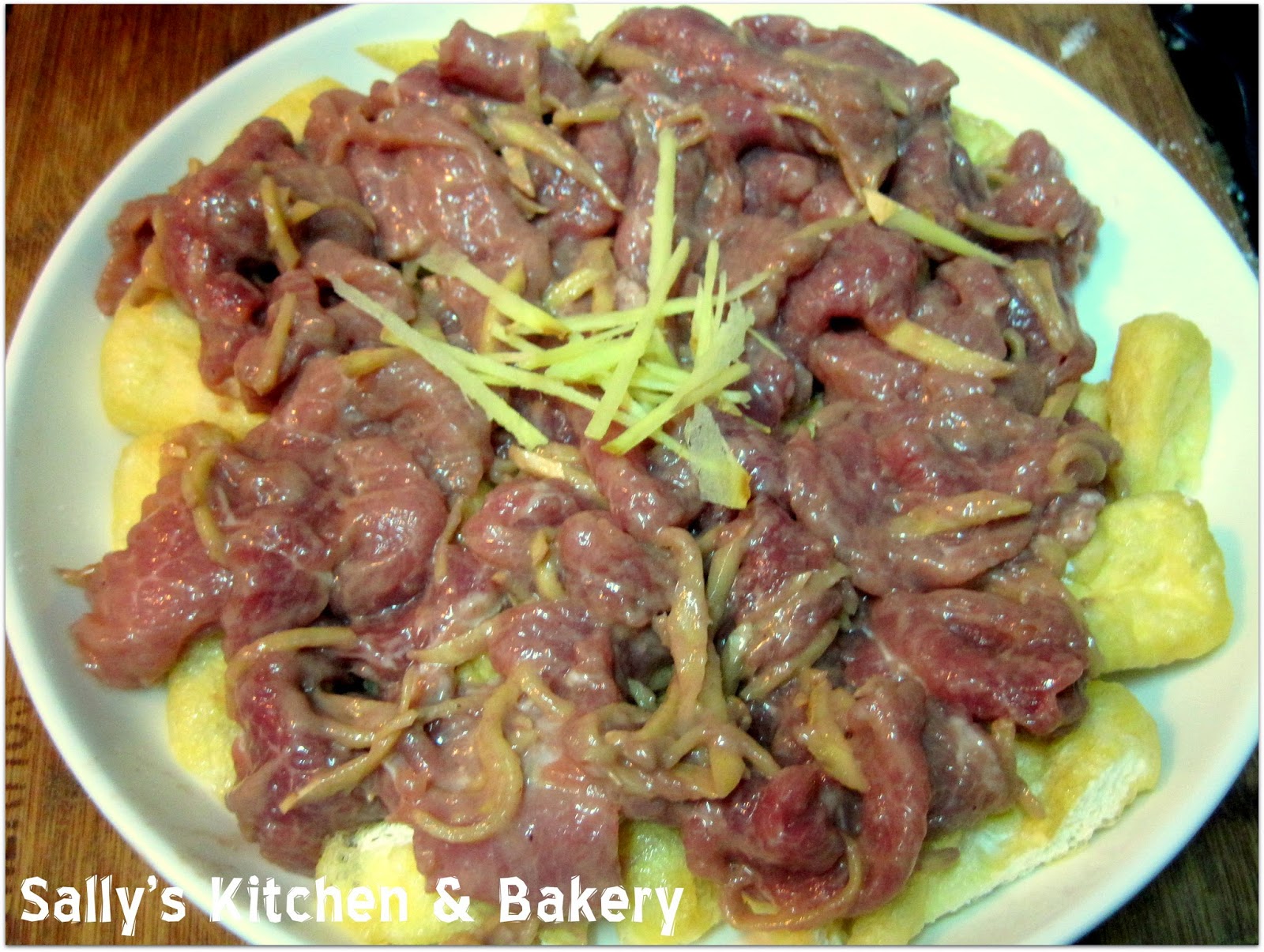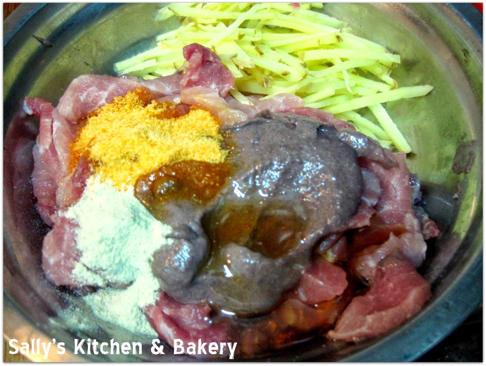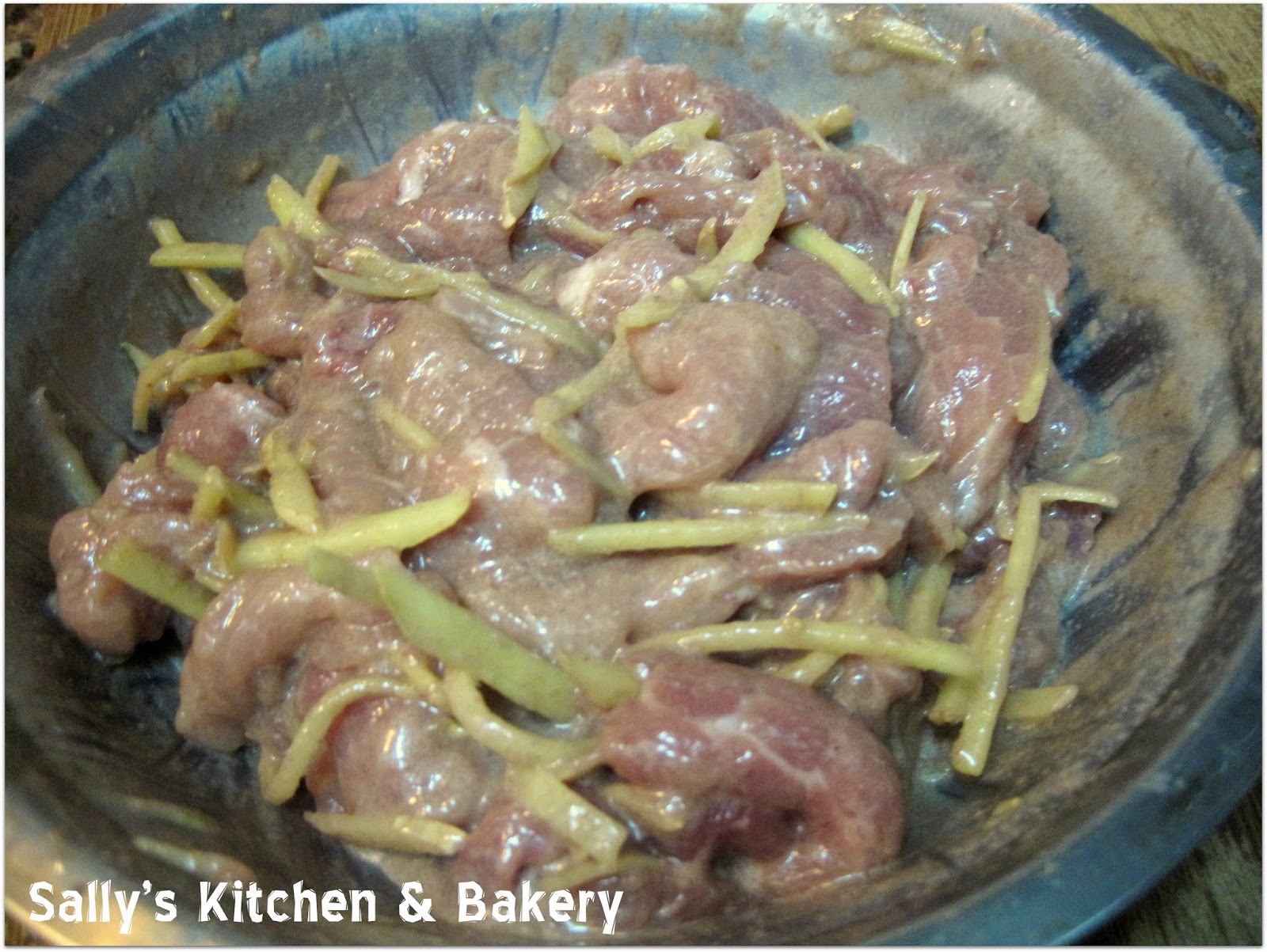 3. 豬肉用調味料連薑絲撈勻,最後慢慢加入水份。放在一旁醃約5-10分鐘。